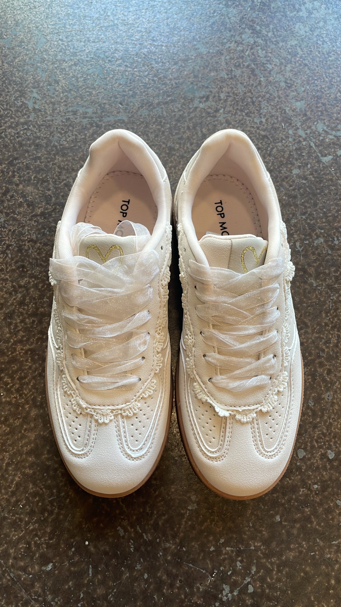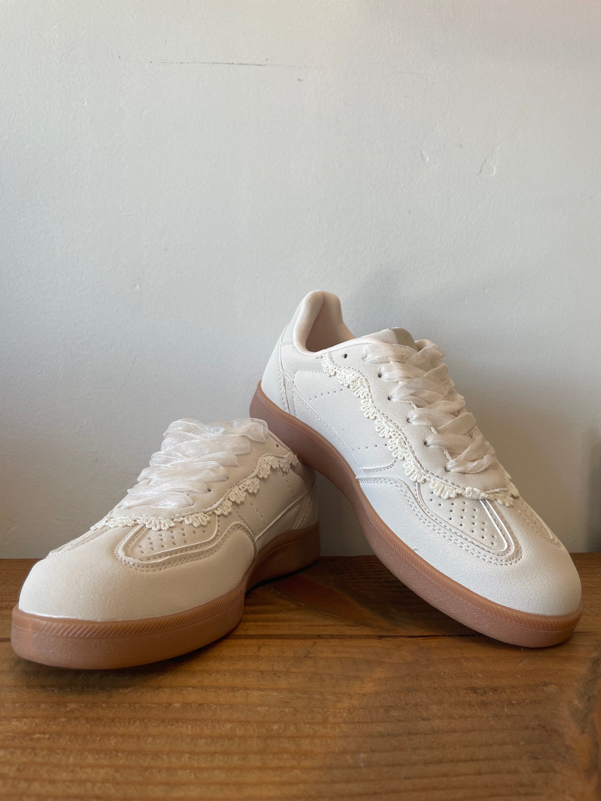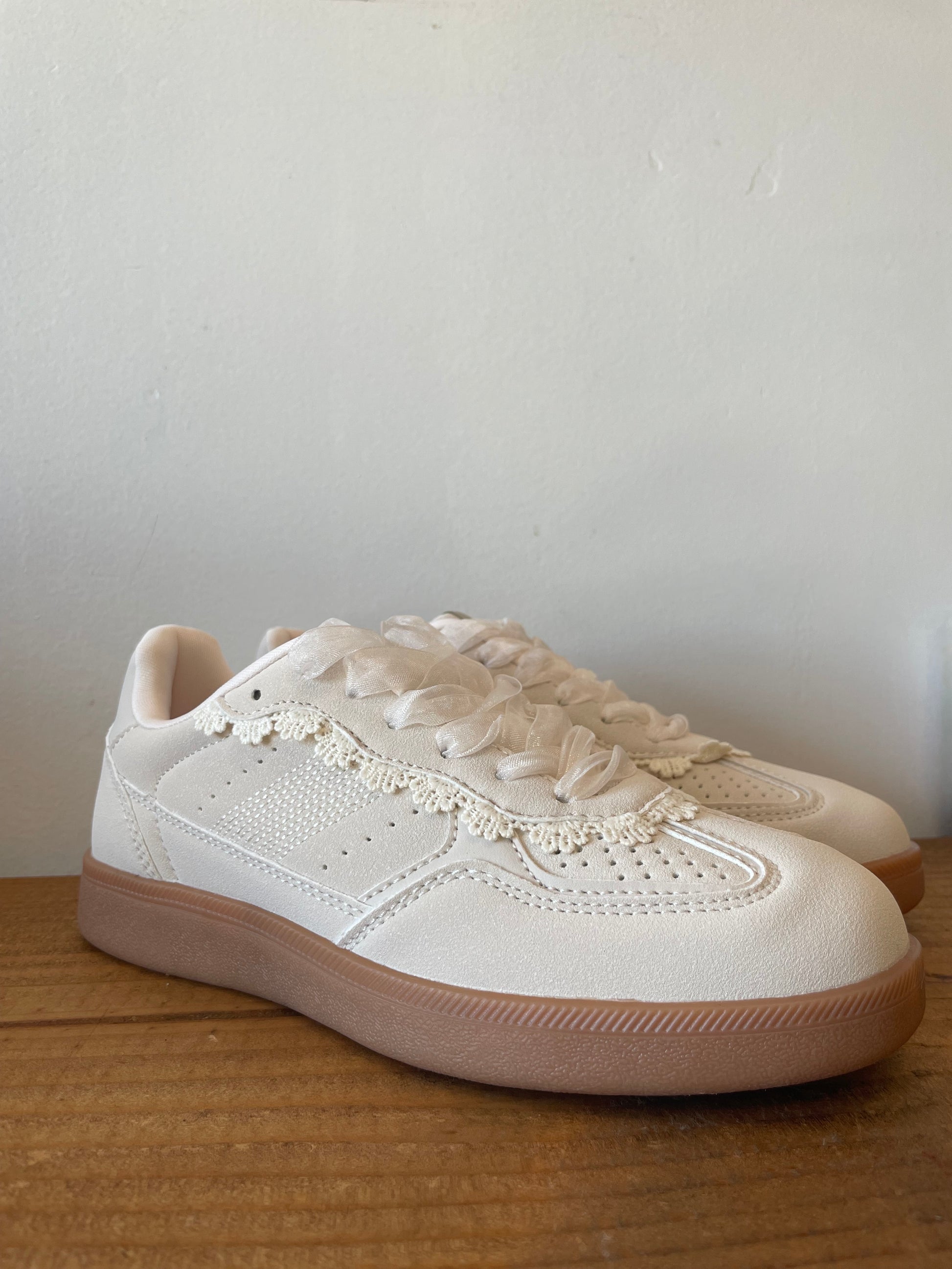 These charming sneakers mix beige, cream, and white hues, featuring adorable lace accents and offering both ribbon and classic laces for a fun twist on your footwear.