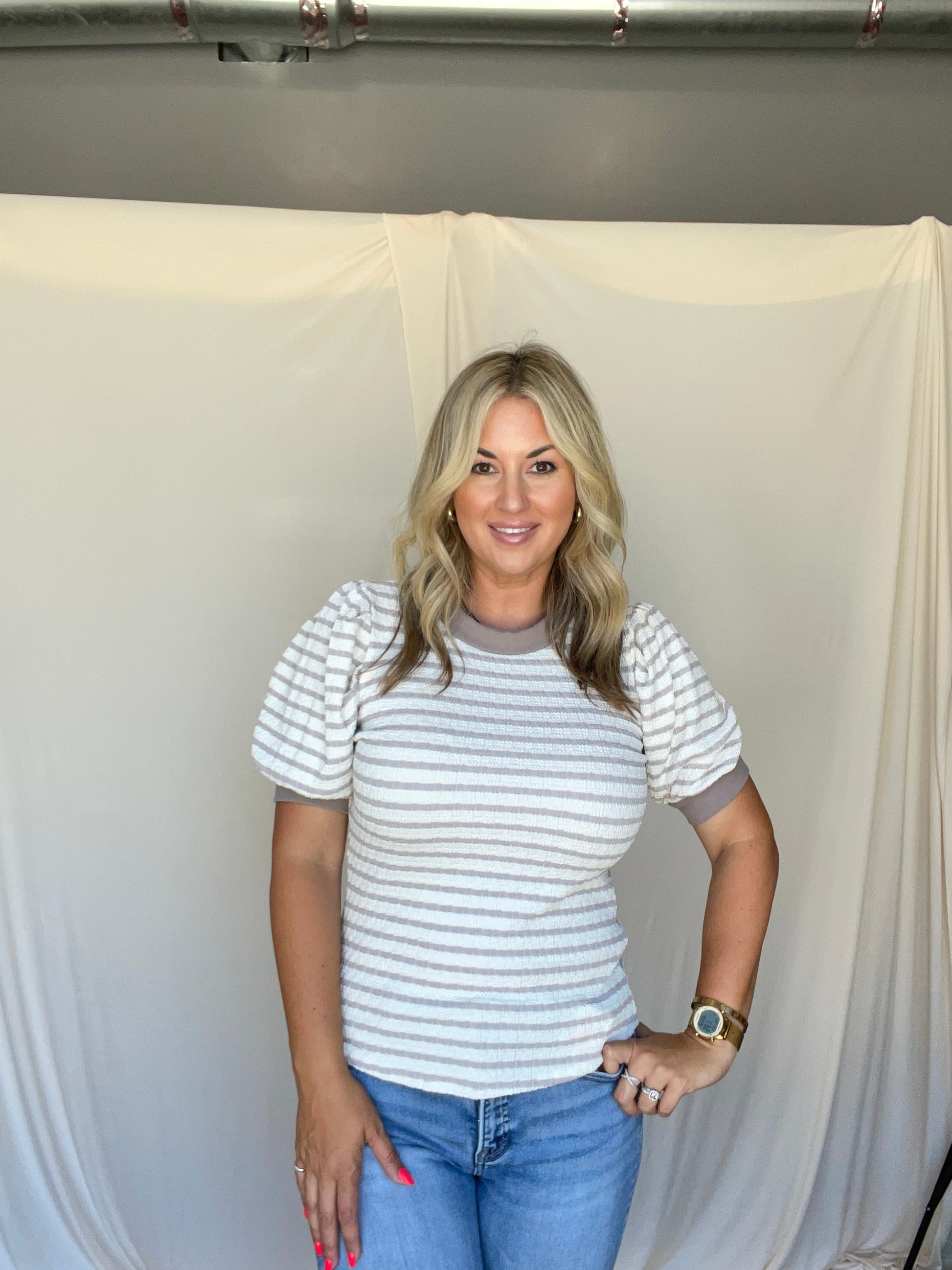 This charming top features playful puffed short sleeves and a round neckline, adorned with white and taupe stripes for a fresh, fun look.
