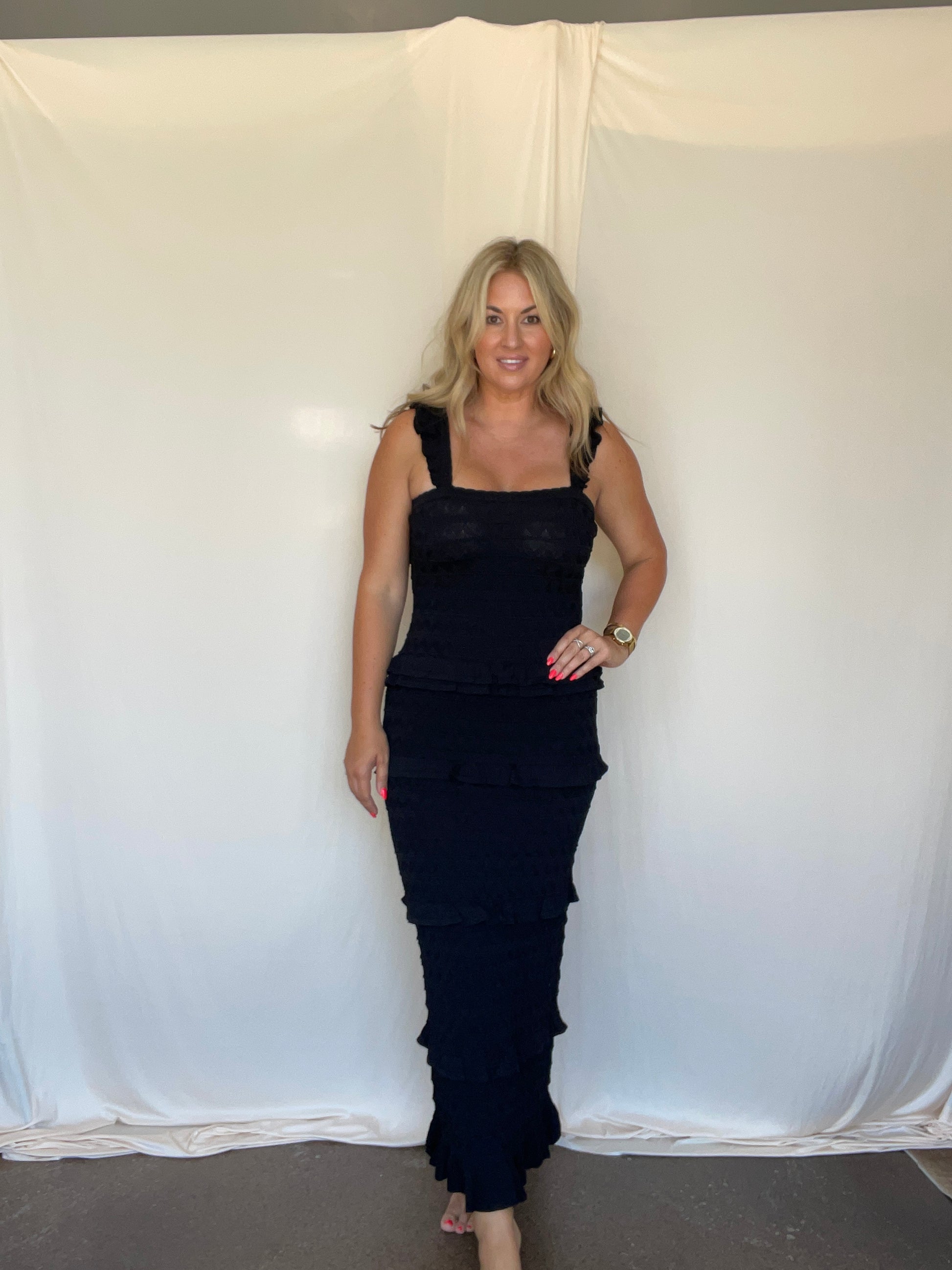 This fun and flirty black midi dress is accented with playful ruffles for a stylish twist.