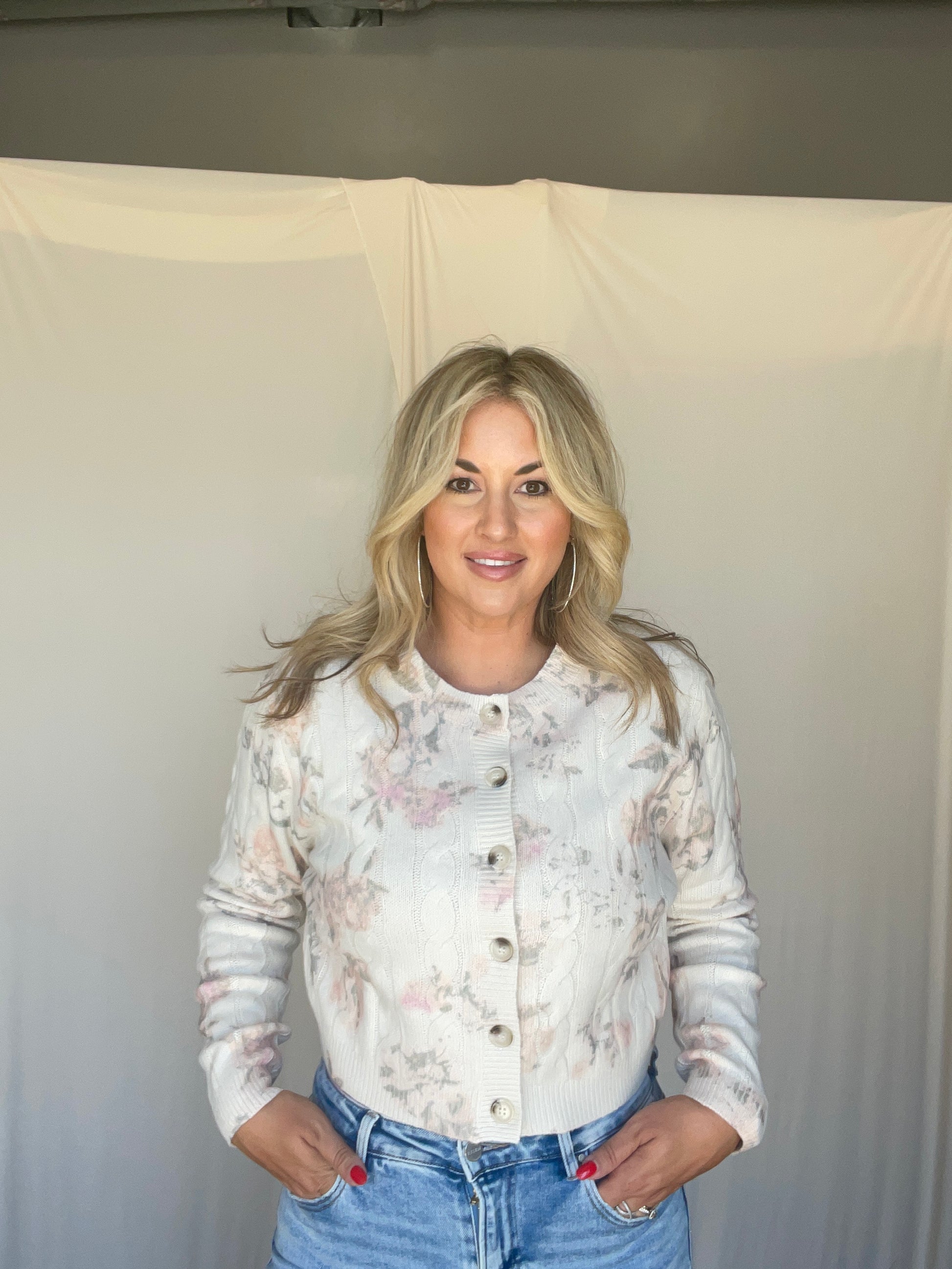 This charming cardigan features a button-down front and delightful pink flower accents, adding a fun and feminine touch to your outfit.