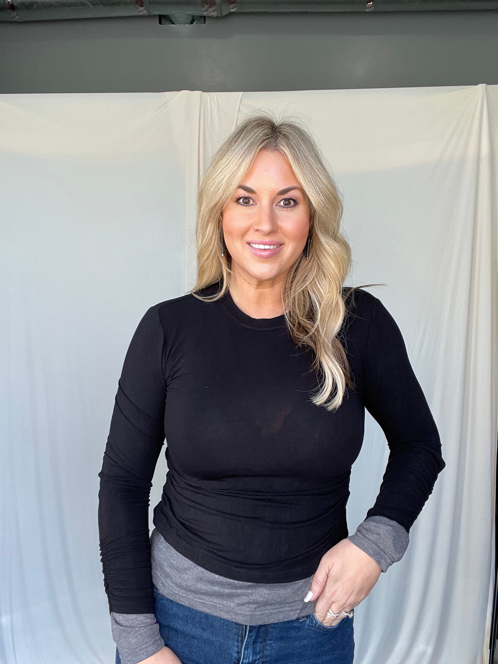 A soft comfortable unique grey color block black top. Will dress up any winter outfit