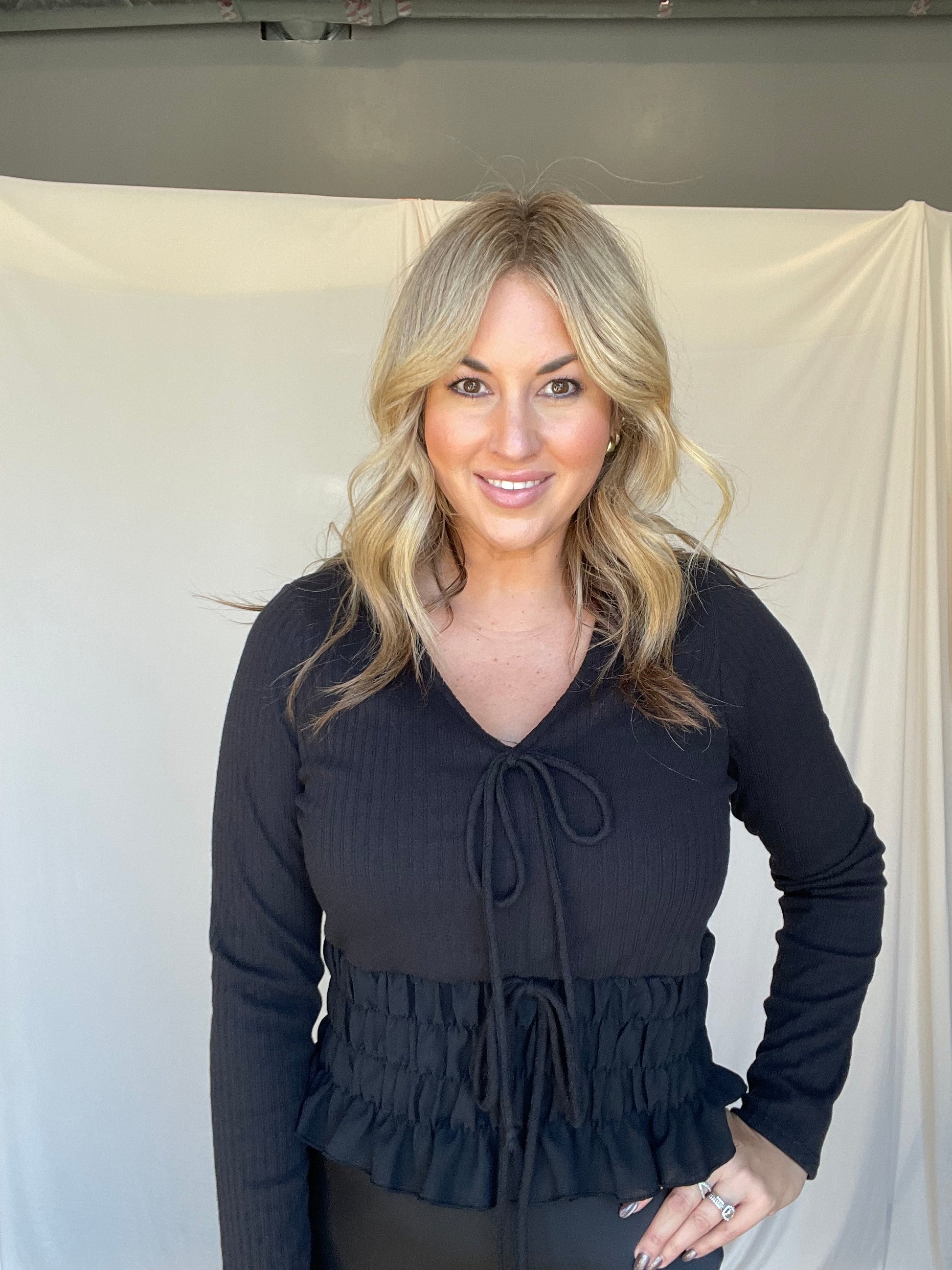 A stunning v-neck long sleeve blouse with a tie detail in the front with a ruched elastic bottom. Would be a great blouse to wear for a first date during the colder months.
