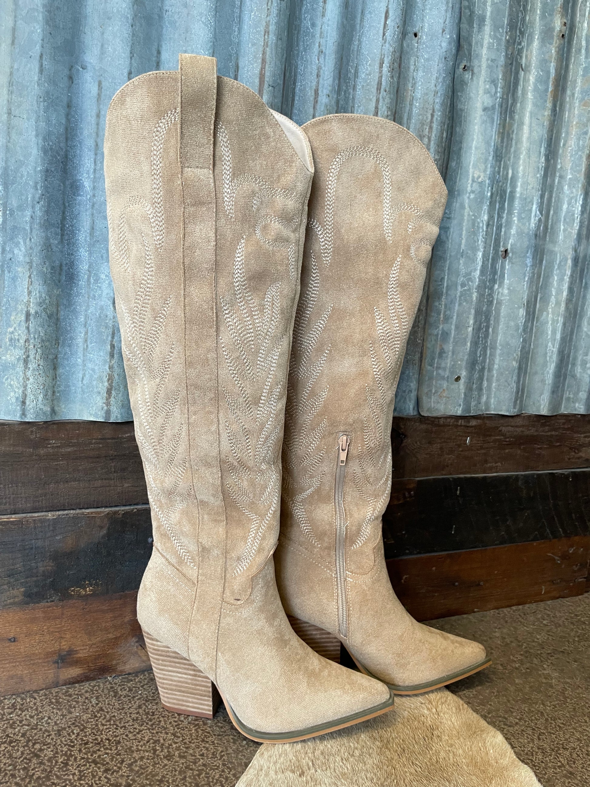 Classic cowboy embroidery on a suede cowboy boot that's been raised to the knees. Shaft Height: 17" Heel Height: 3.5" Type of Closure: Zipper Circumference of Shoe Opening: 15.5" Shaft Circumference: 10.5".