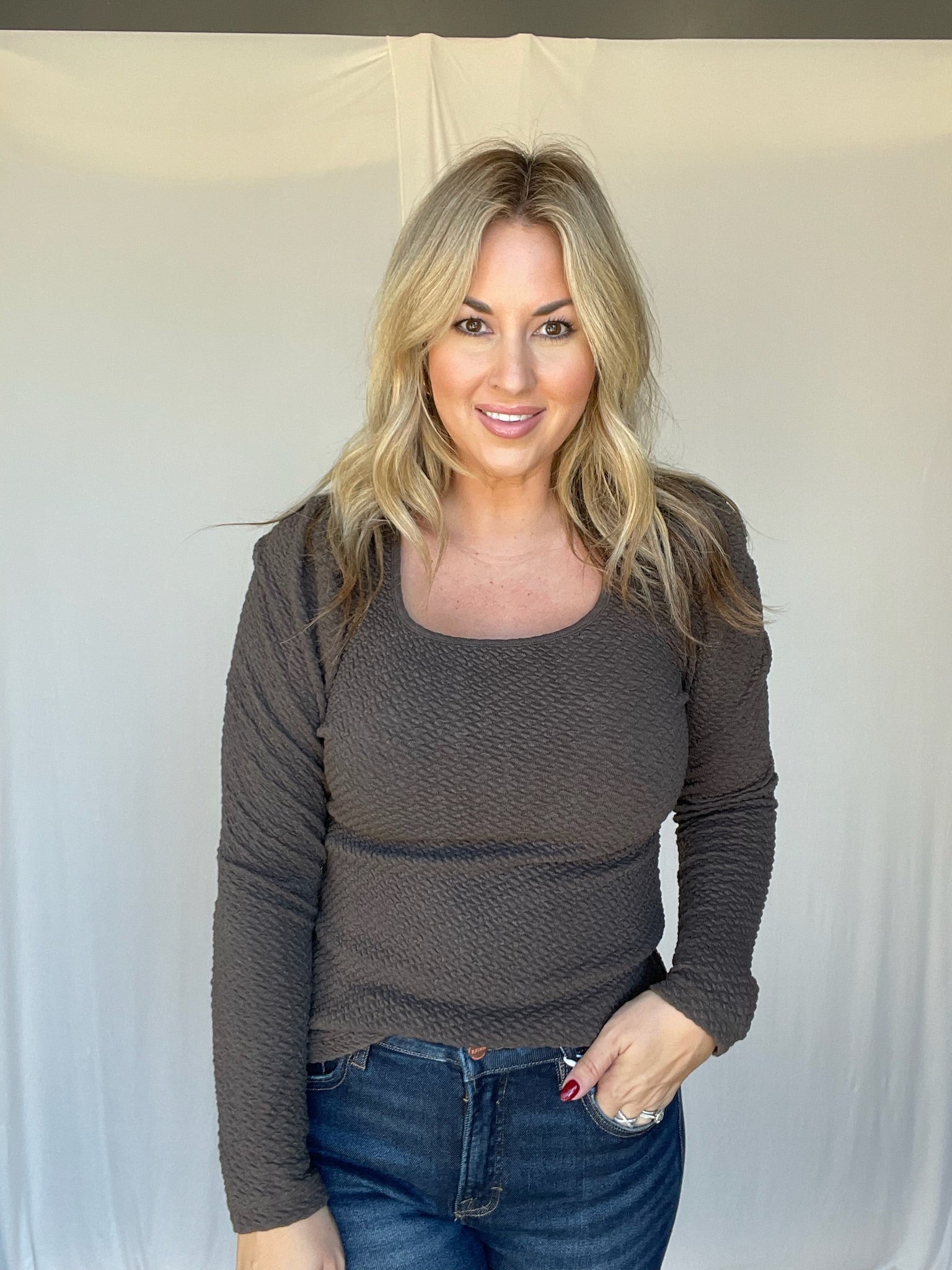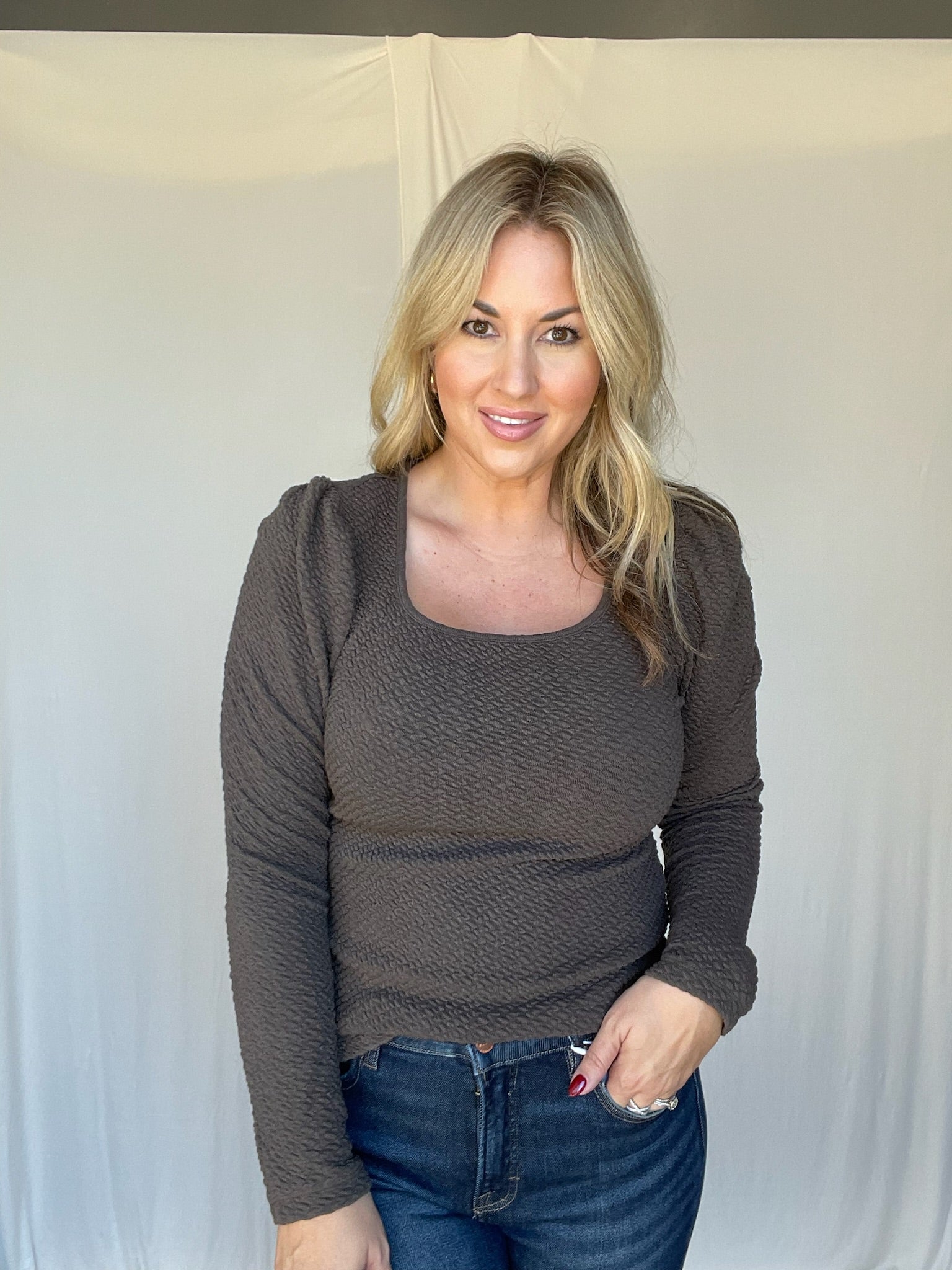 A popcorn textured knit square neckline puff long sleeve. Dressy cute during the chilly weather