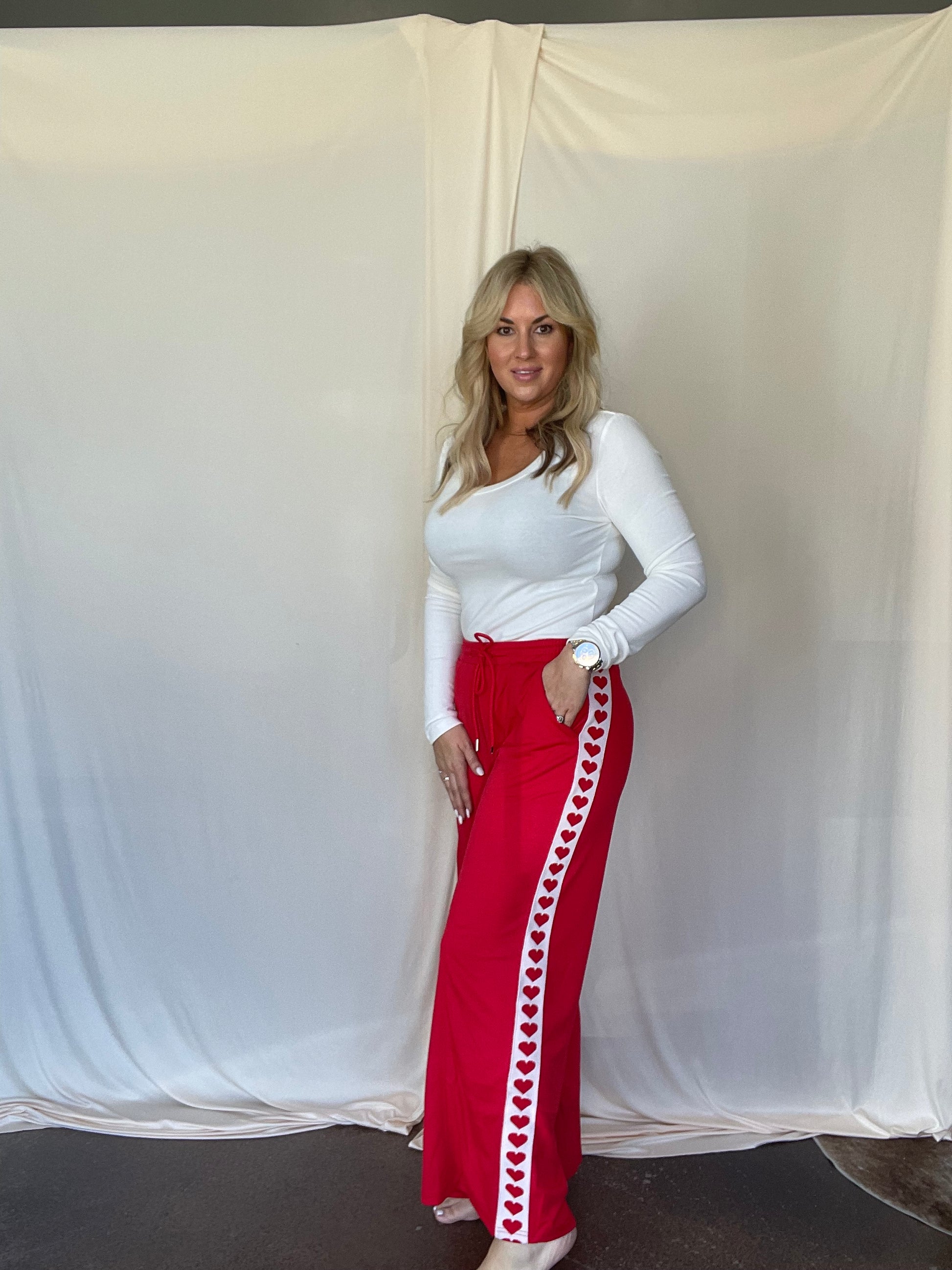 Valentine heart side tape french terry wide pants. Stay festive with these sweapants not only can you wear them during valentines but any season