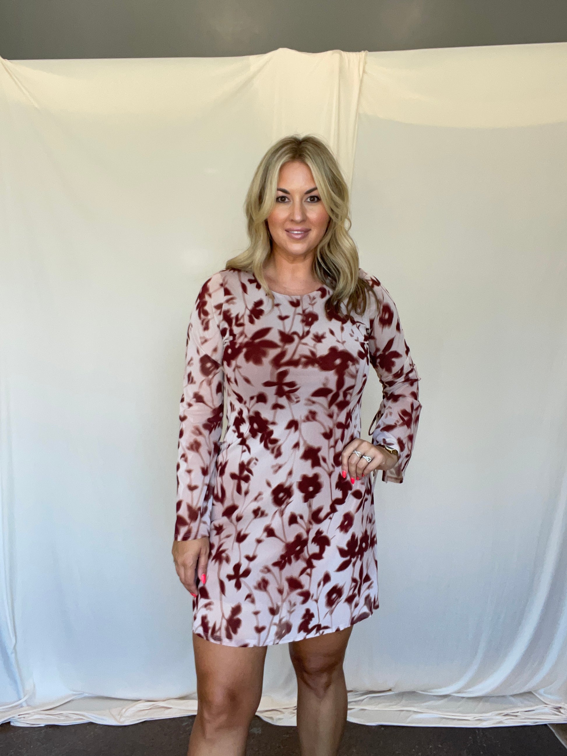 This flowy floral dress features a round neckline, long bell sleeves with playful tie accents, and a flared hem that moves with you.