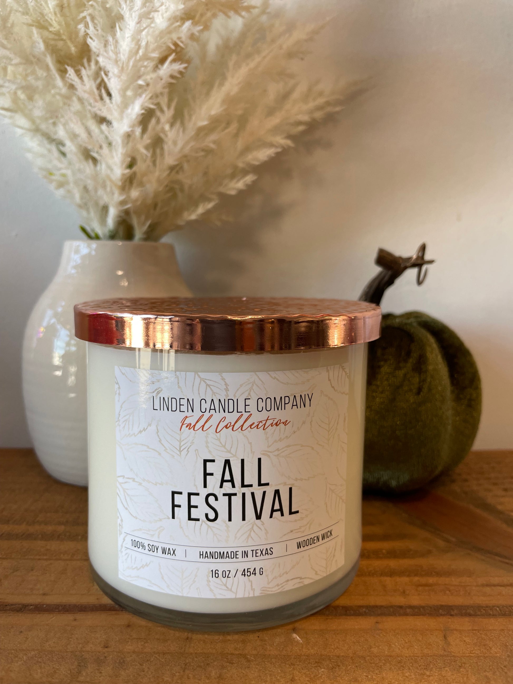 16oz wooden wick candle that smells like a fall festival