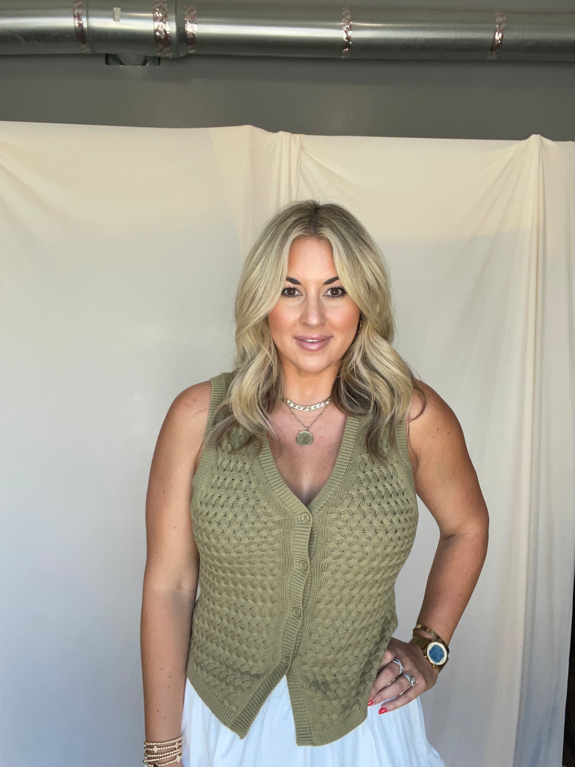This charming green sweater vest features playful front buttons for a fun and stylish look.