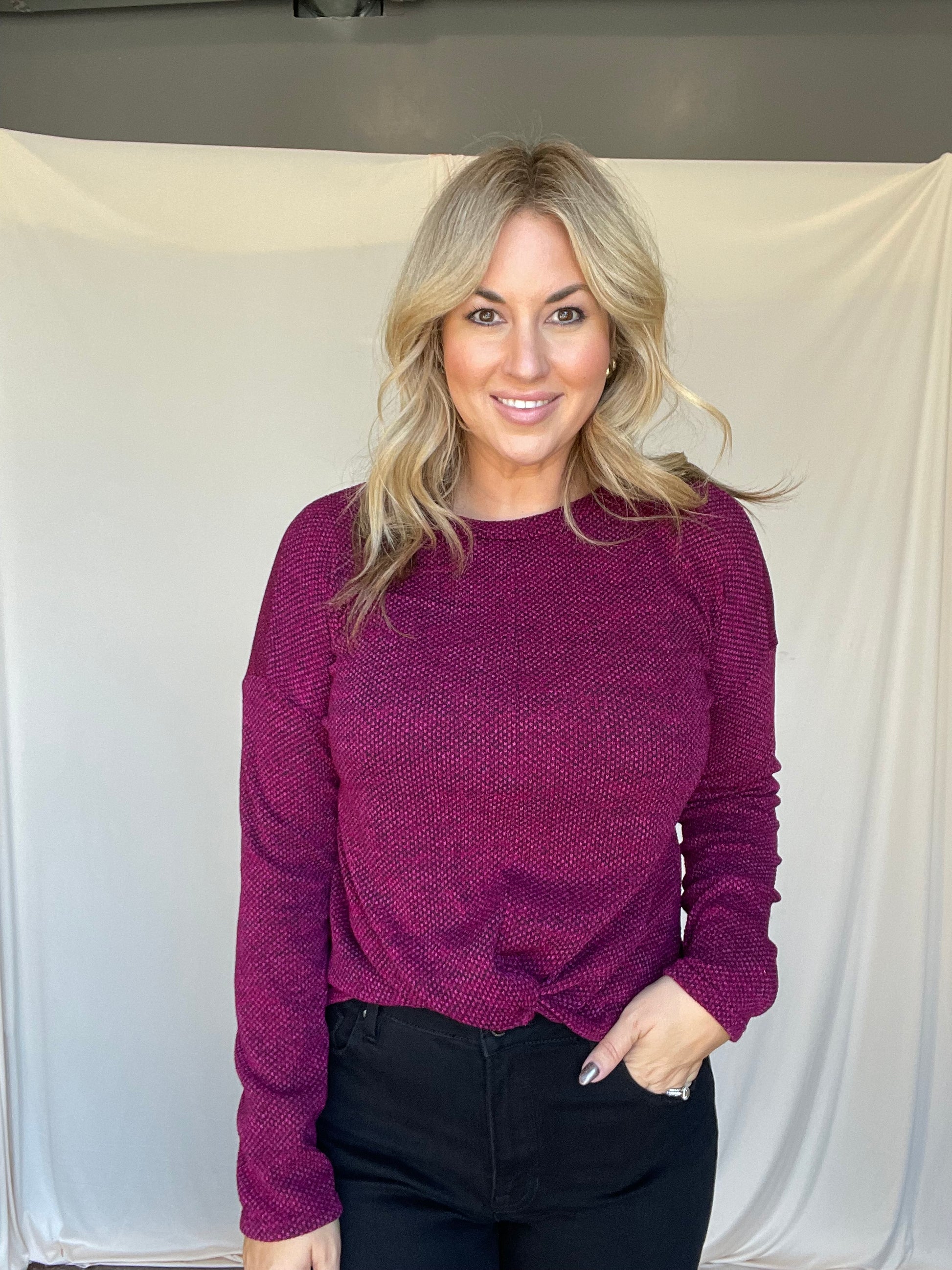 A beautiful magenta top with tones of black mixed in and it has with a twist detail at the bottom. Feels like a sweater that one would wear to a holiday party or through the holiday season. So warm and cozy.