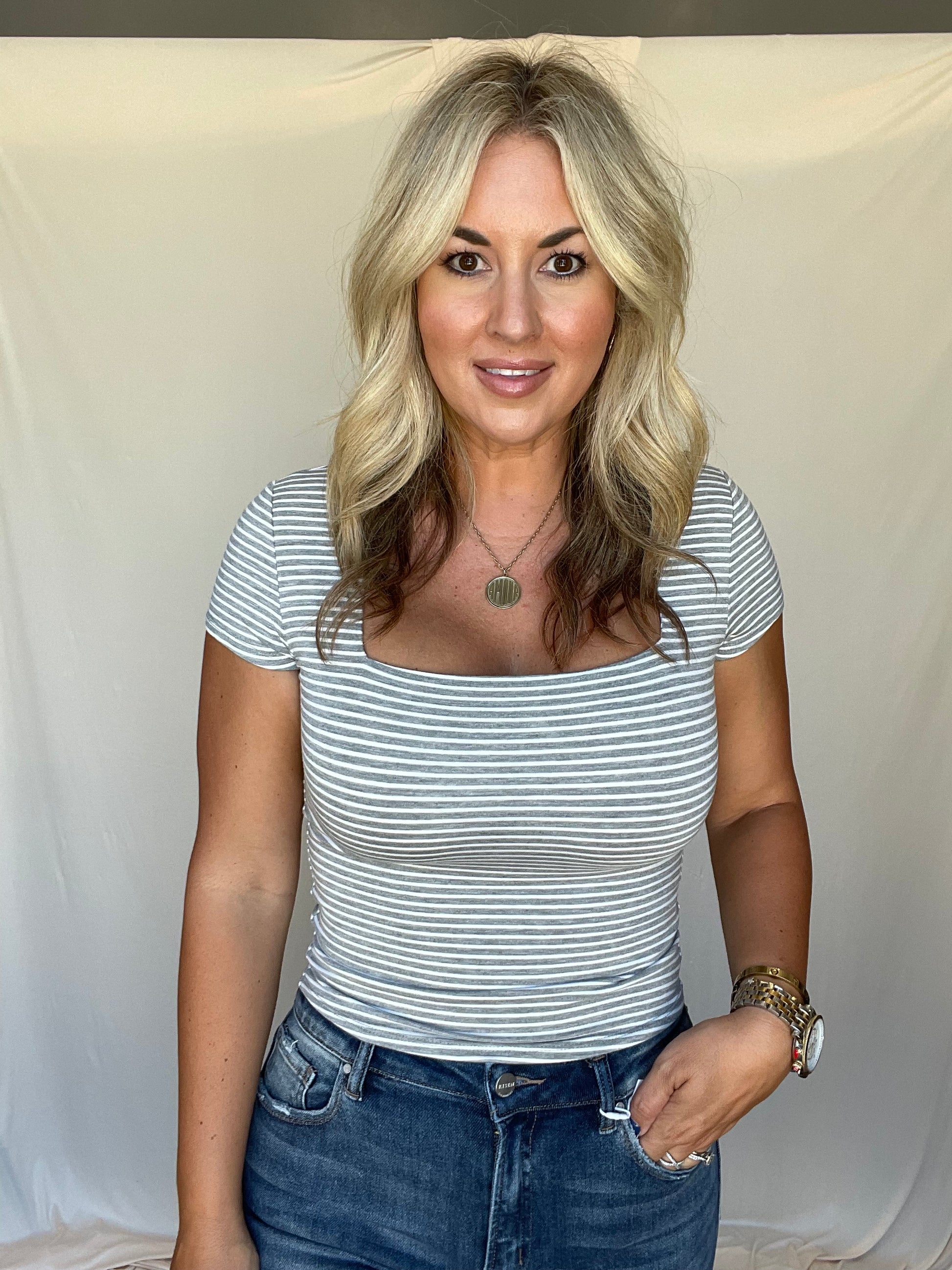 Square neck stripe top.