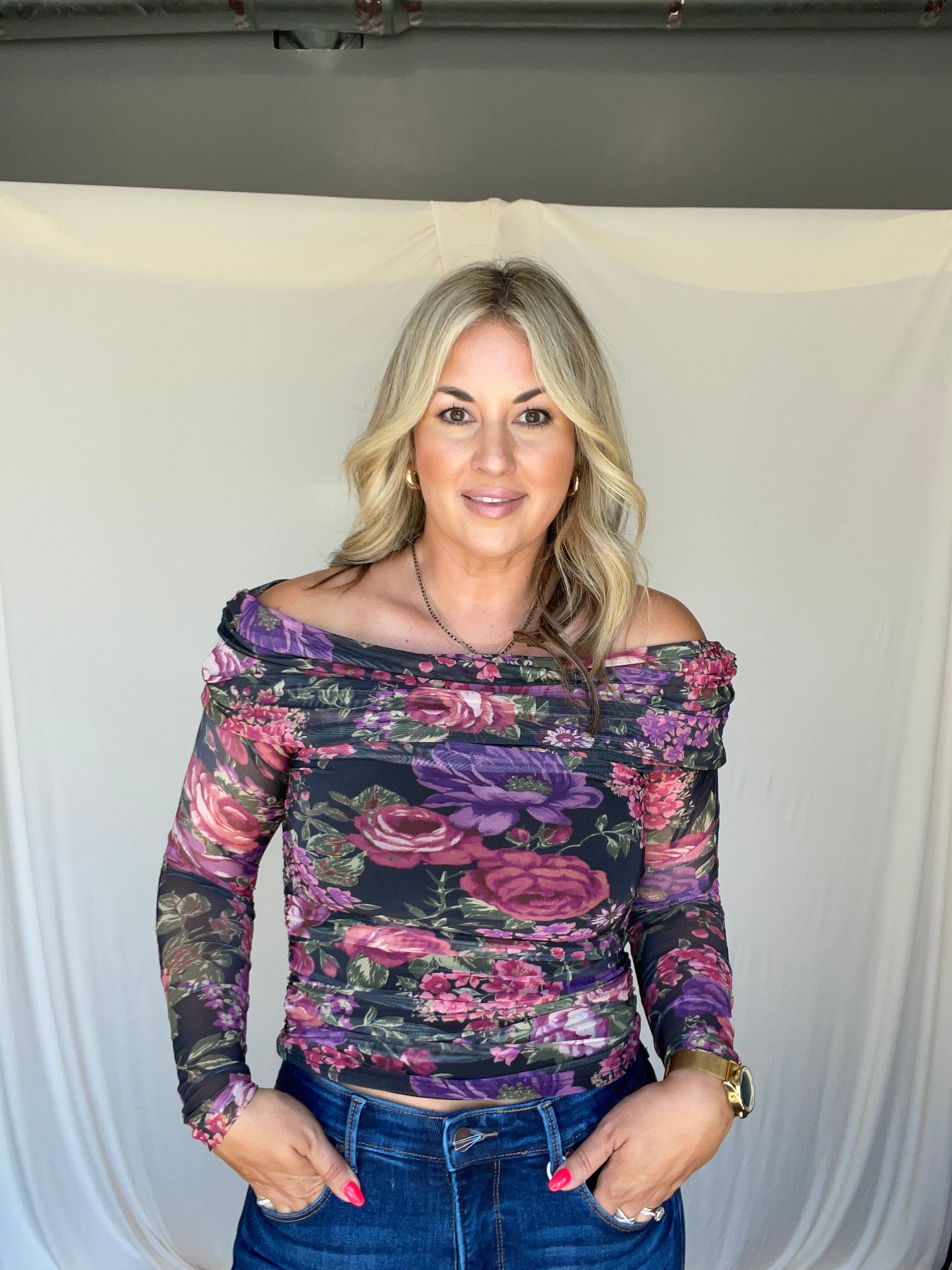 This playful black blouse with florals features a fold-over off-shoulder design with long sleeves