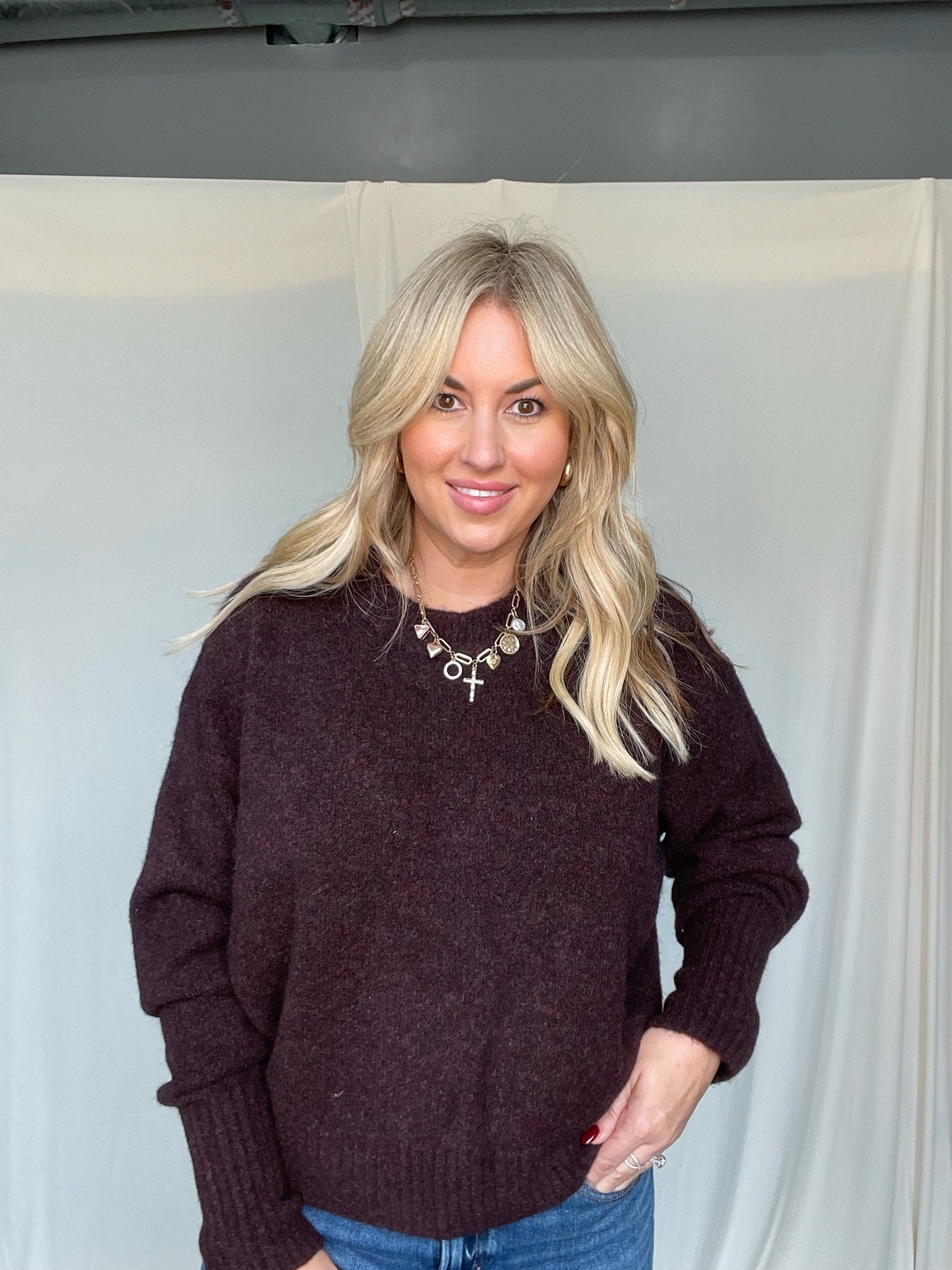 Our sweater features a soft fuzzy wool mixed knit texture for a cozy, warm feel and an oversized fit.