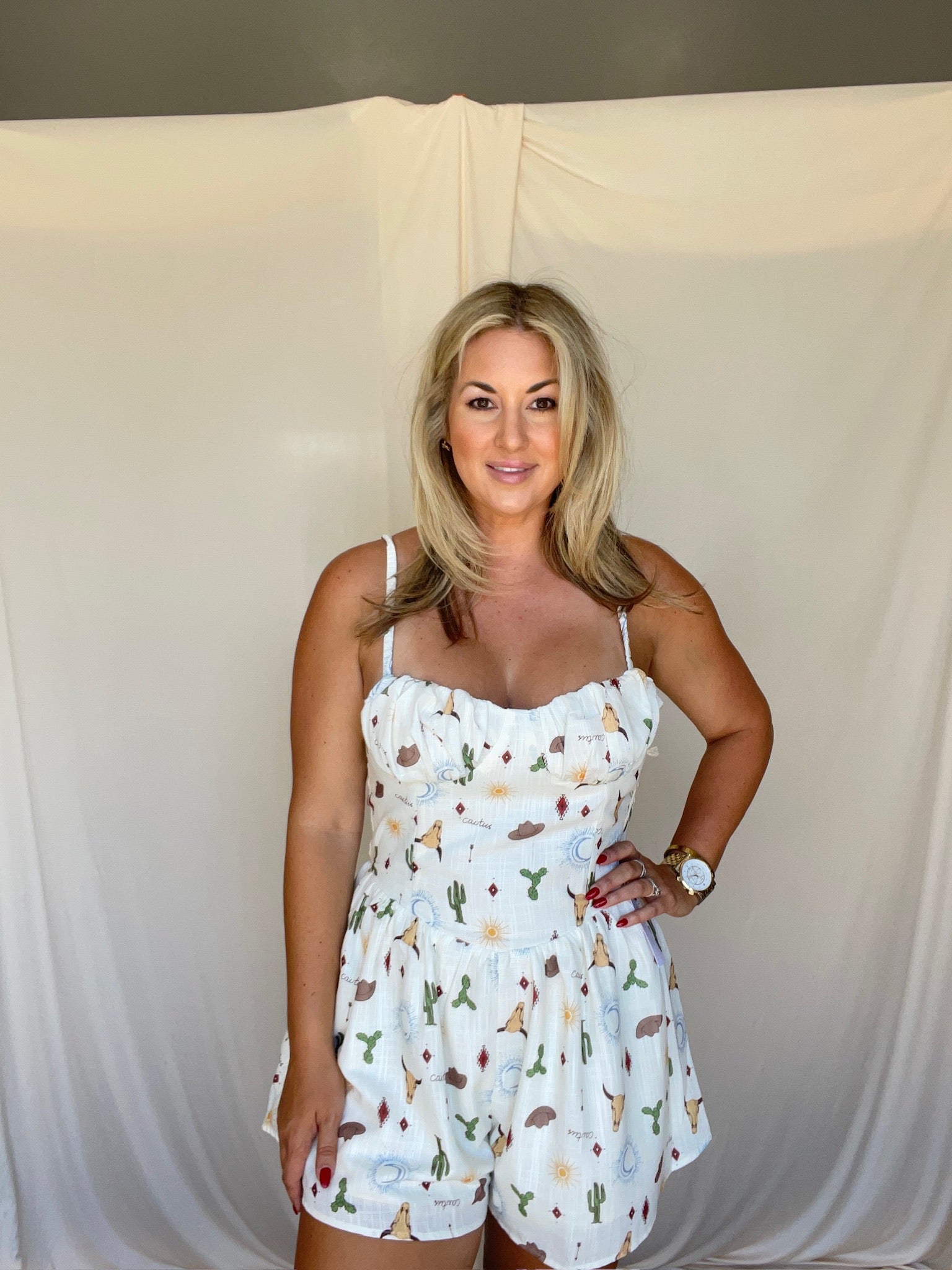 This romper features a charming country print and comfy elastic straps for a fun, easygoing look.
