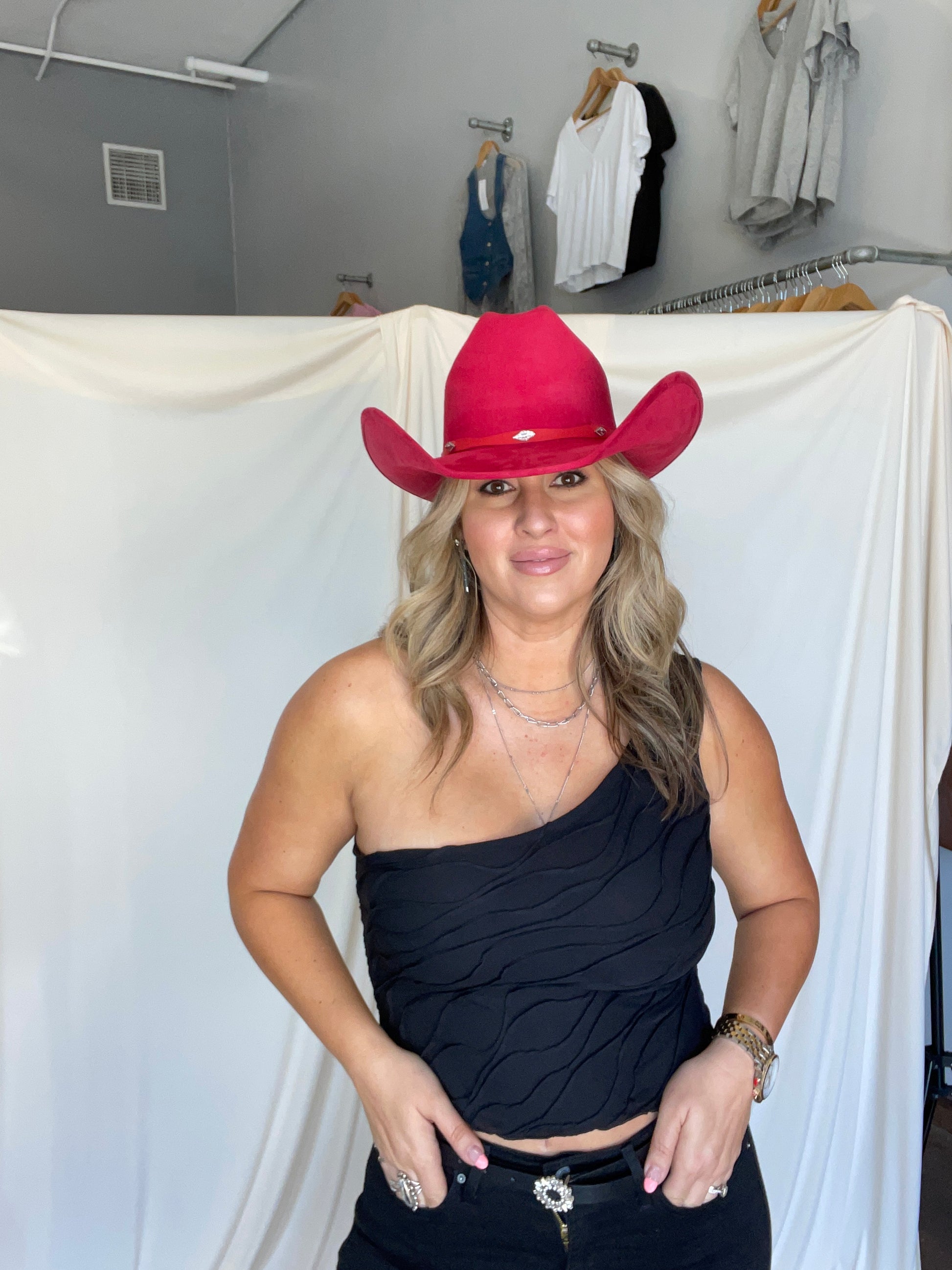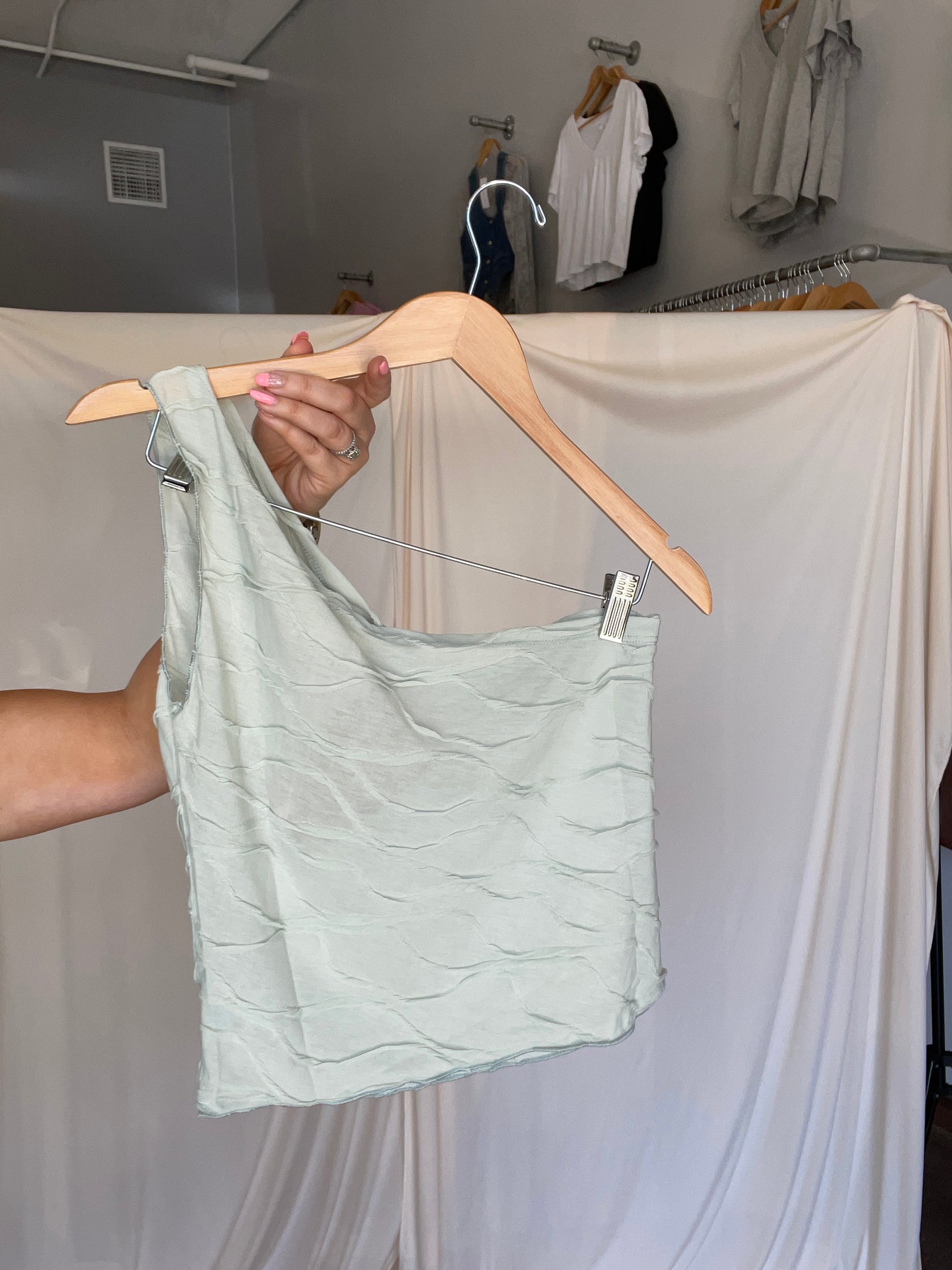 Asymmetrical wave one shoulder top.