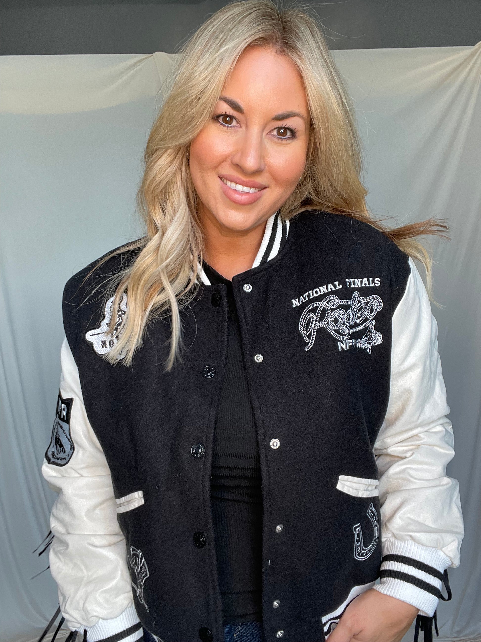 A black and white varisty jacket with fringe. Such a a unique gem for NFR