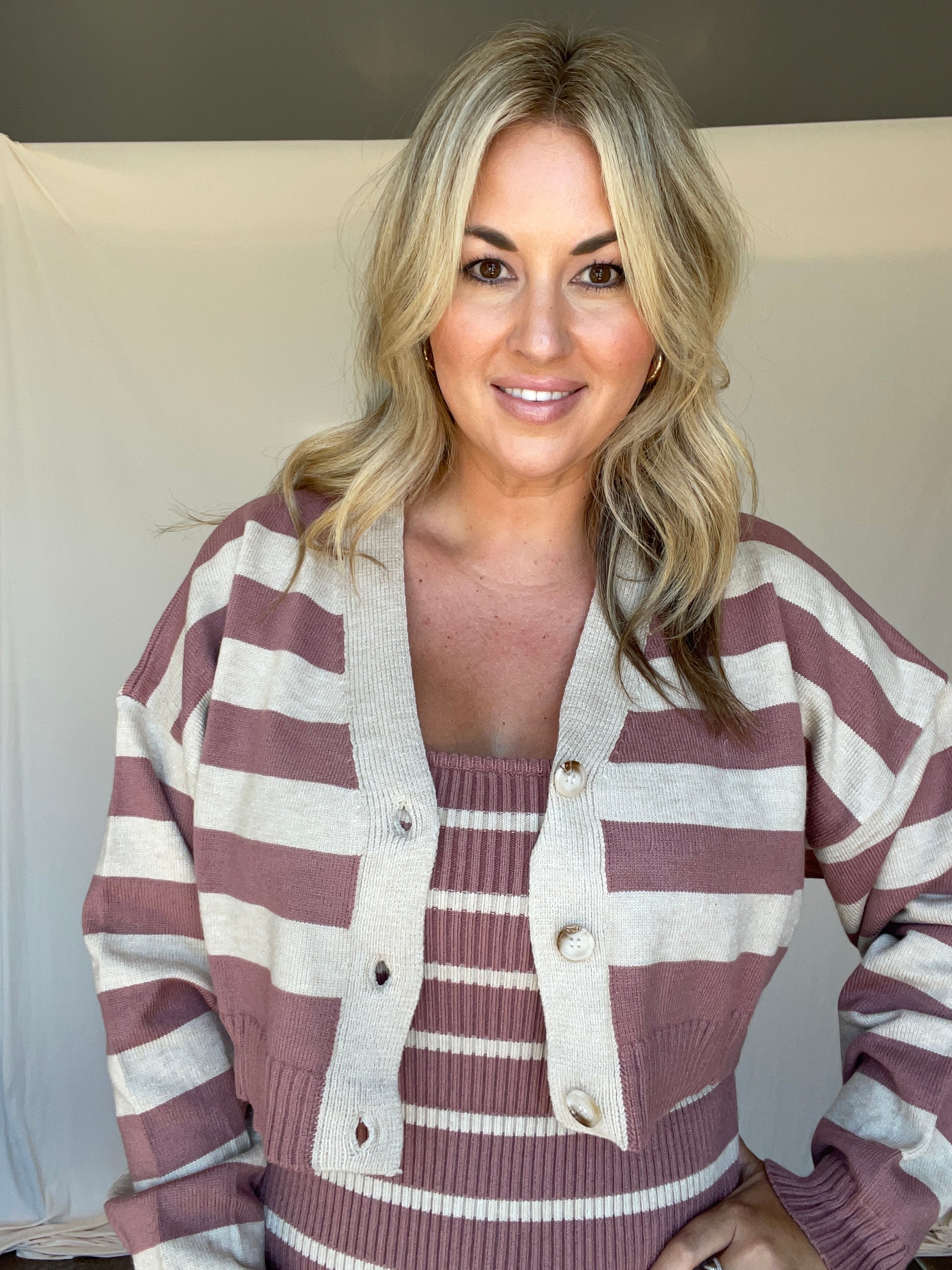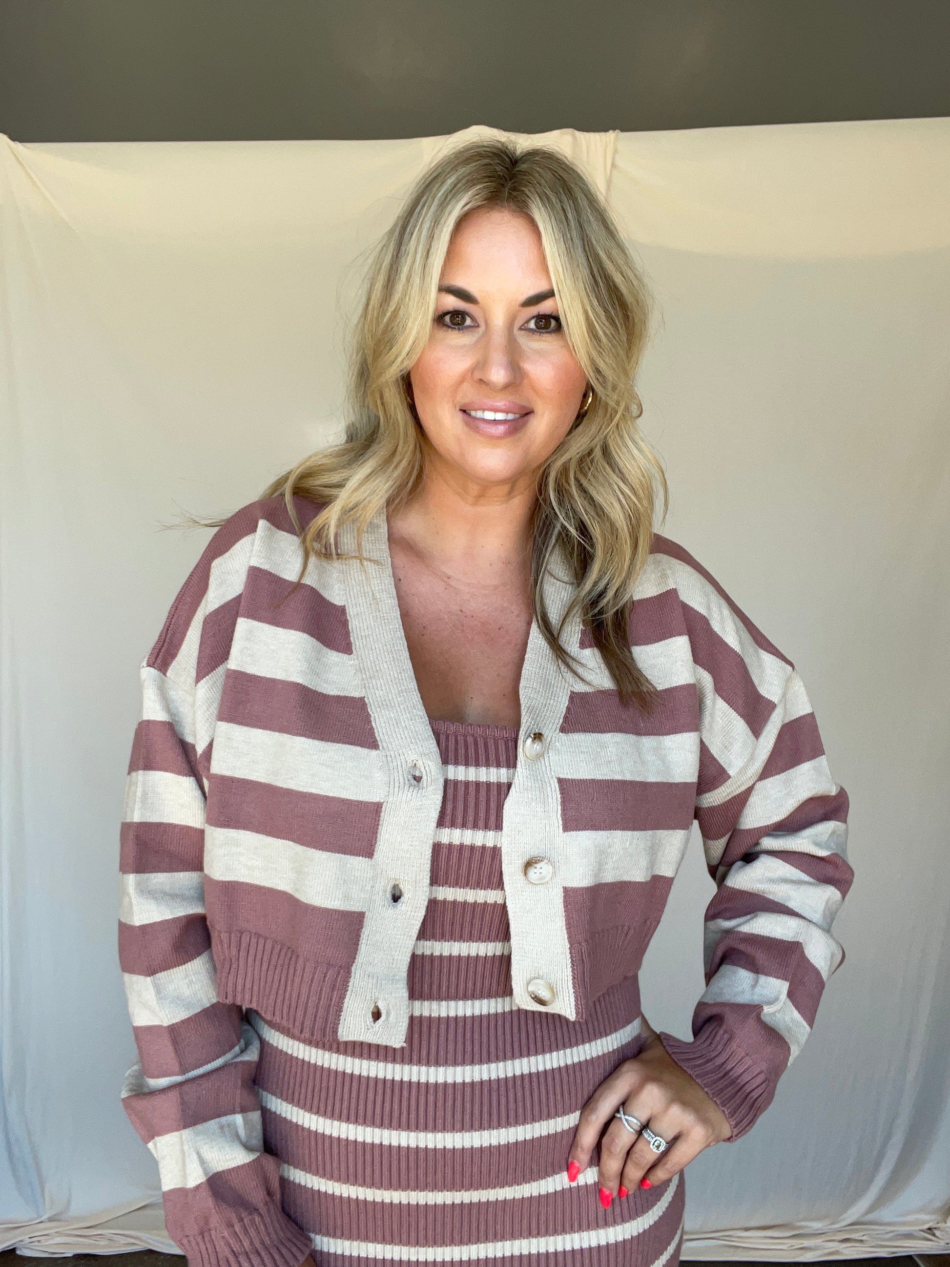 This charming dark pink cardigan features playful cream stripes, adding a fun twist to your cozy wardrobe.