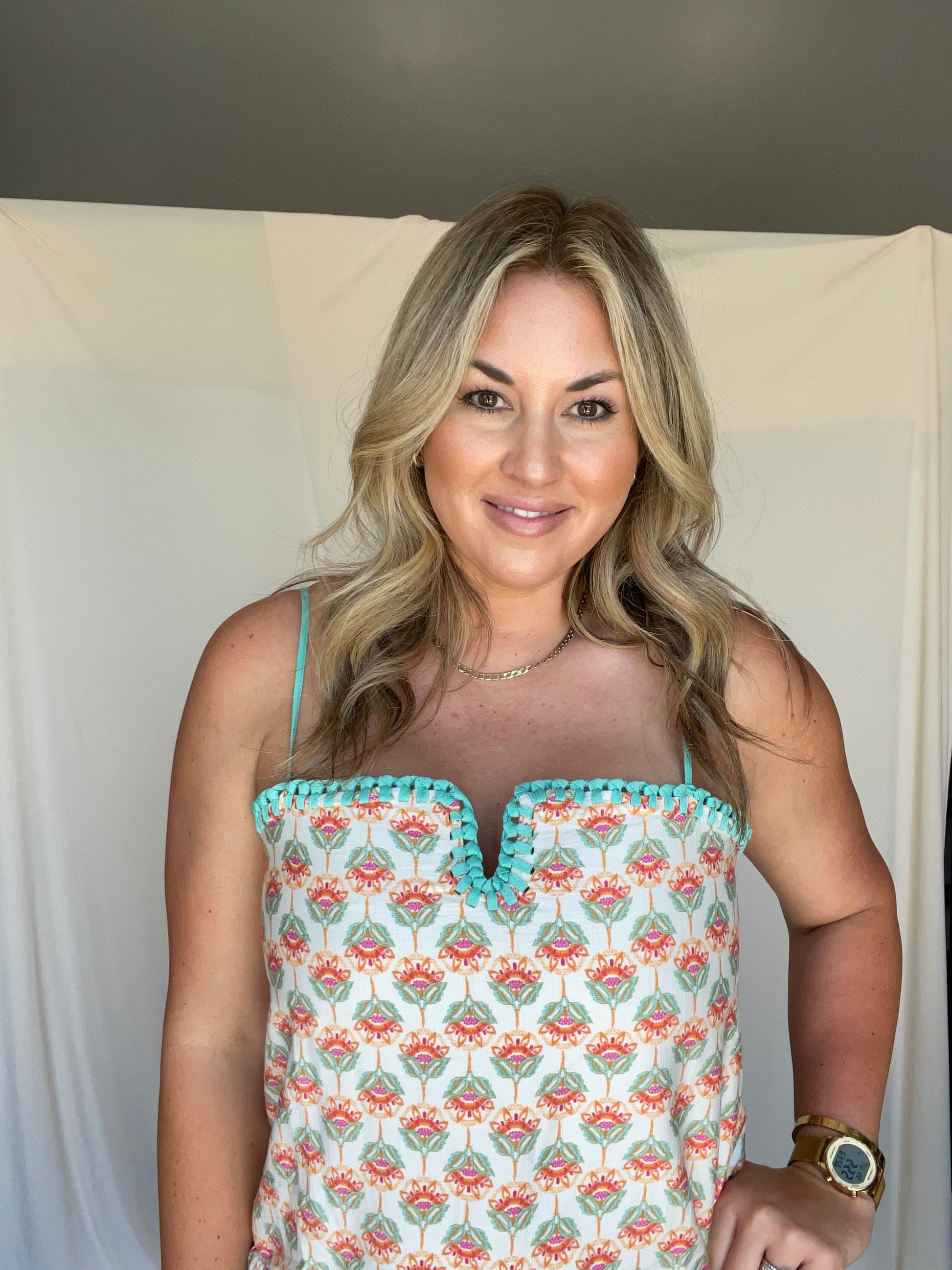 Drop waist floral print dress with braiding detail.