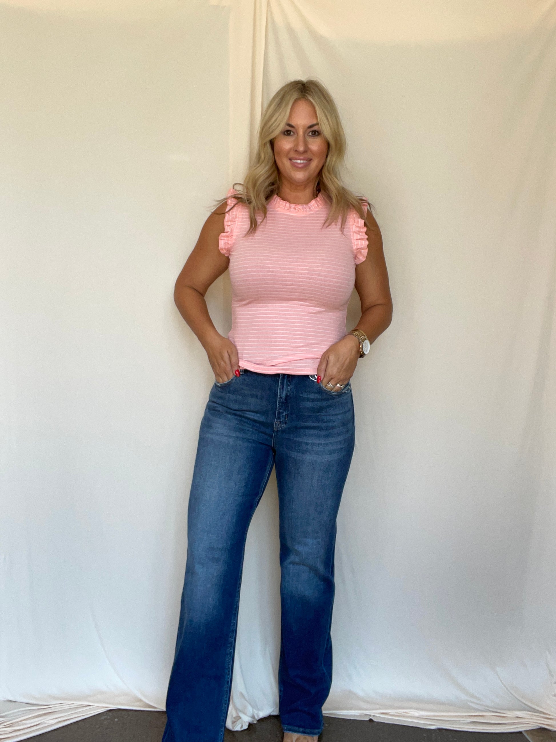 High rise, straight leg jeans.