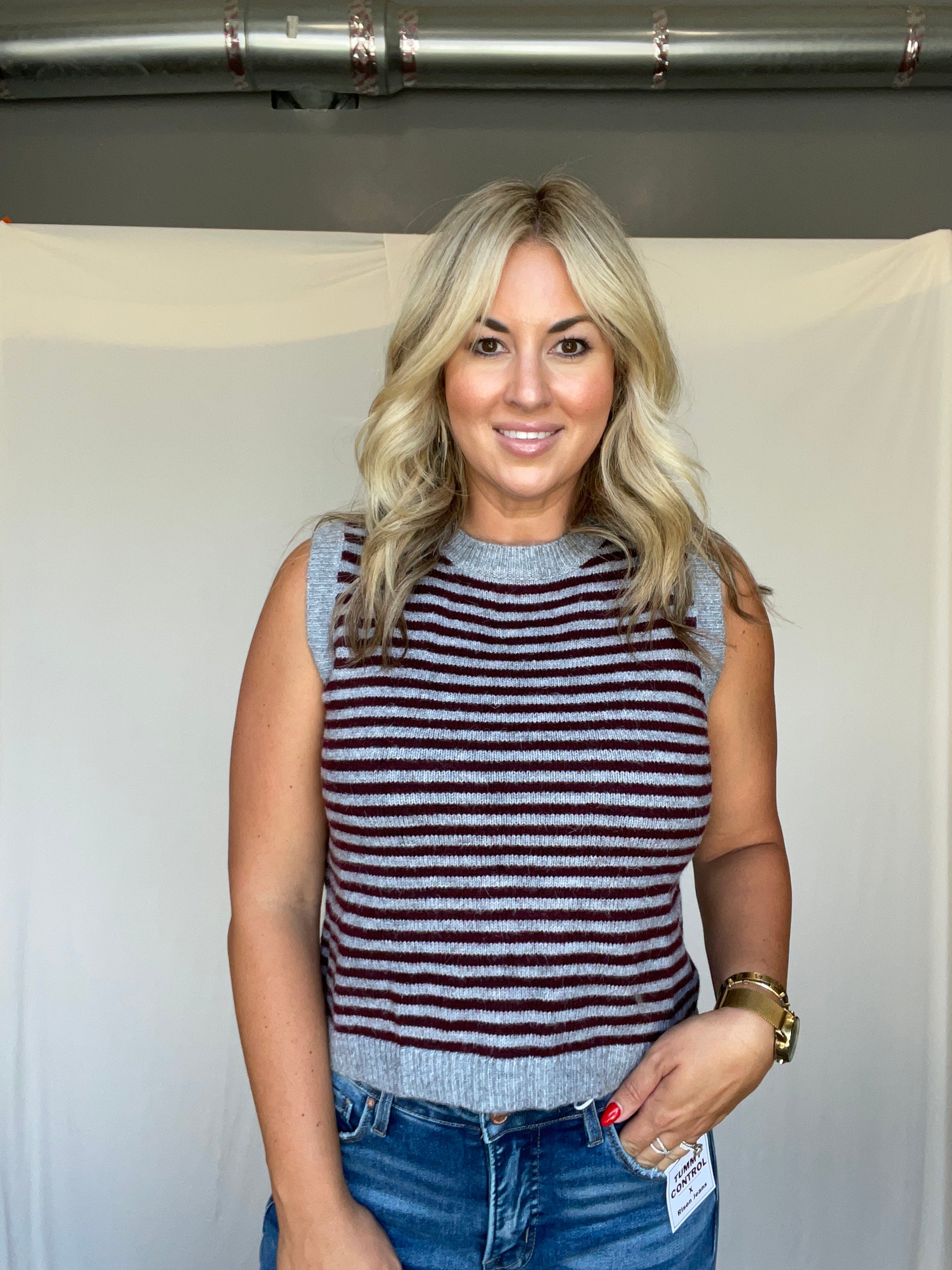 A cozy, thick sweater vest featuring playful grey and wine stripes with a comfy round neckline.
