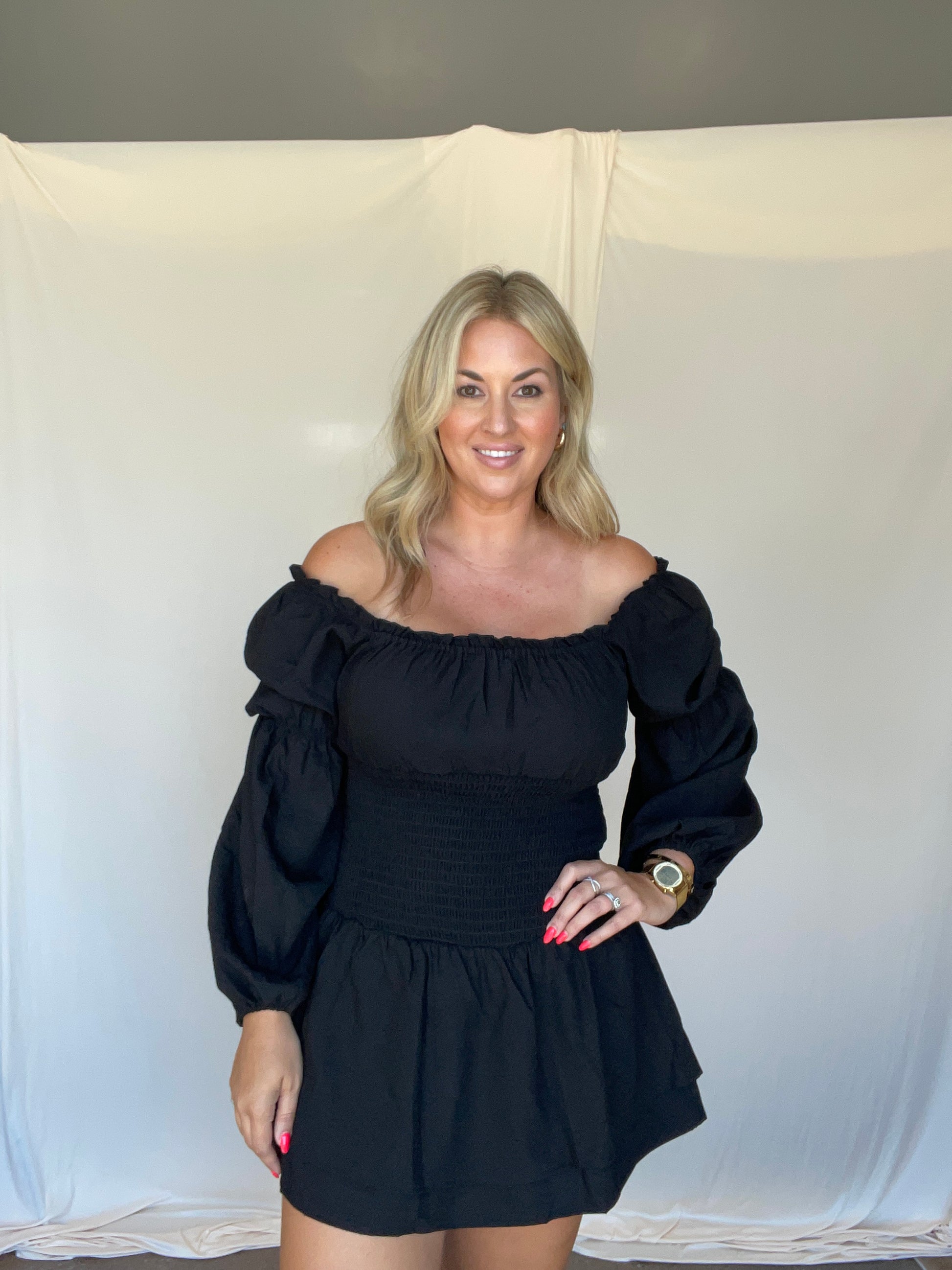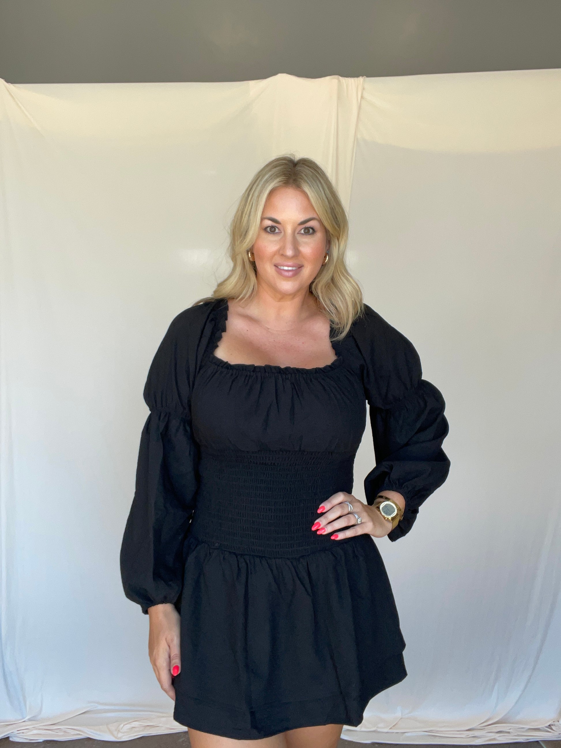 This black dress features a playful square neckline with a smocked bodice and long sleeves, combining comfort and style effortlessly.