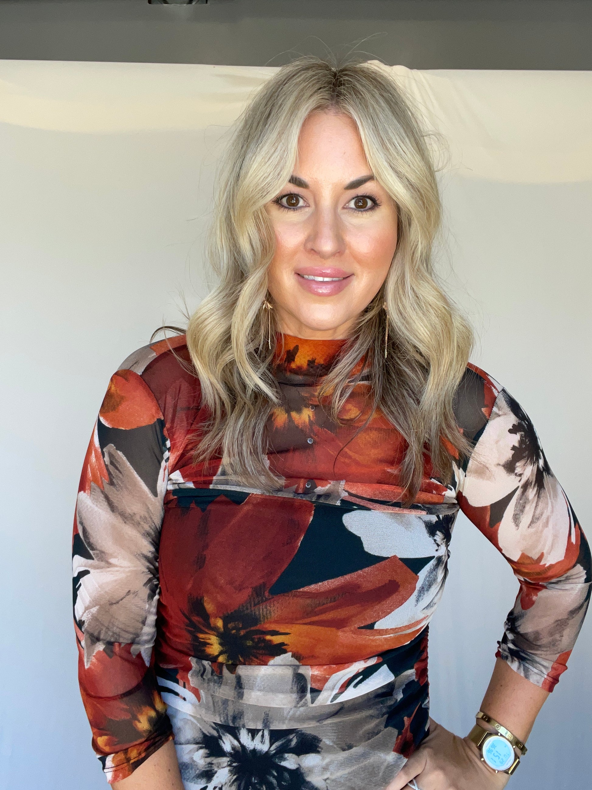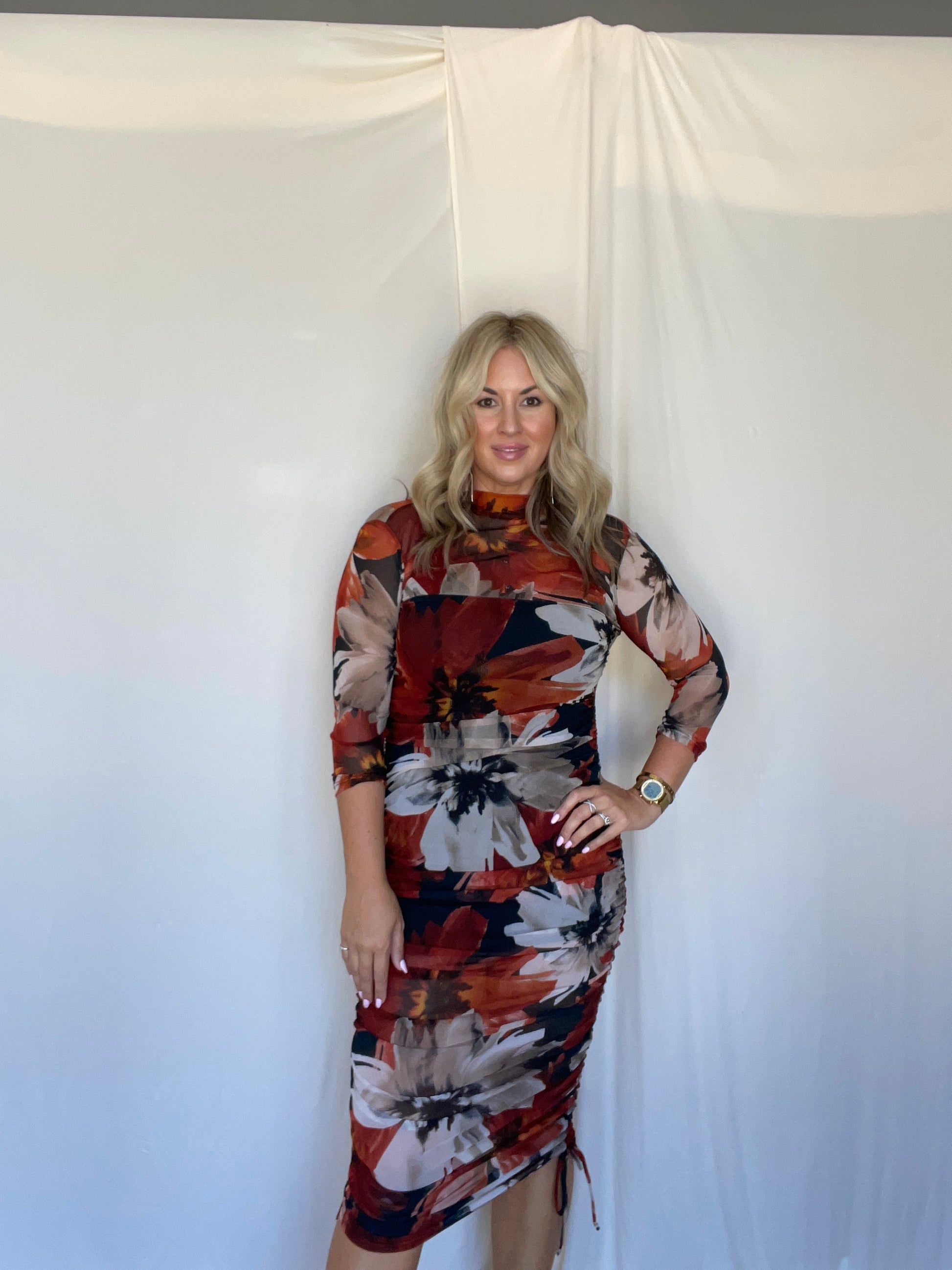 Mock neck, long sleeve, side shirring detail, floral print mesh midi dress,