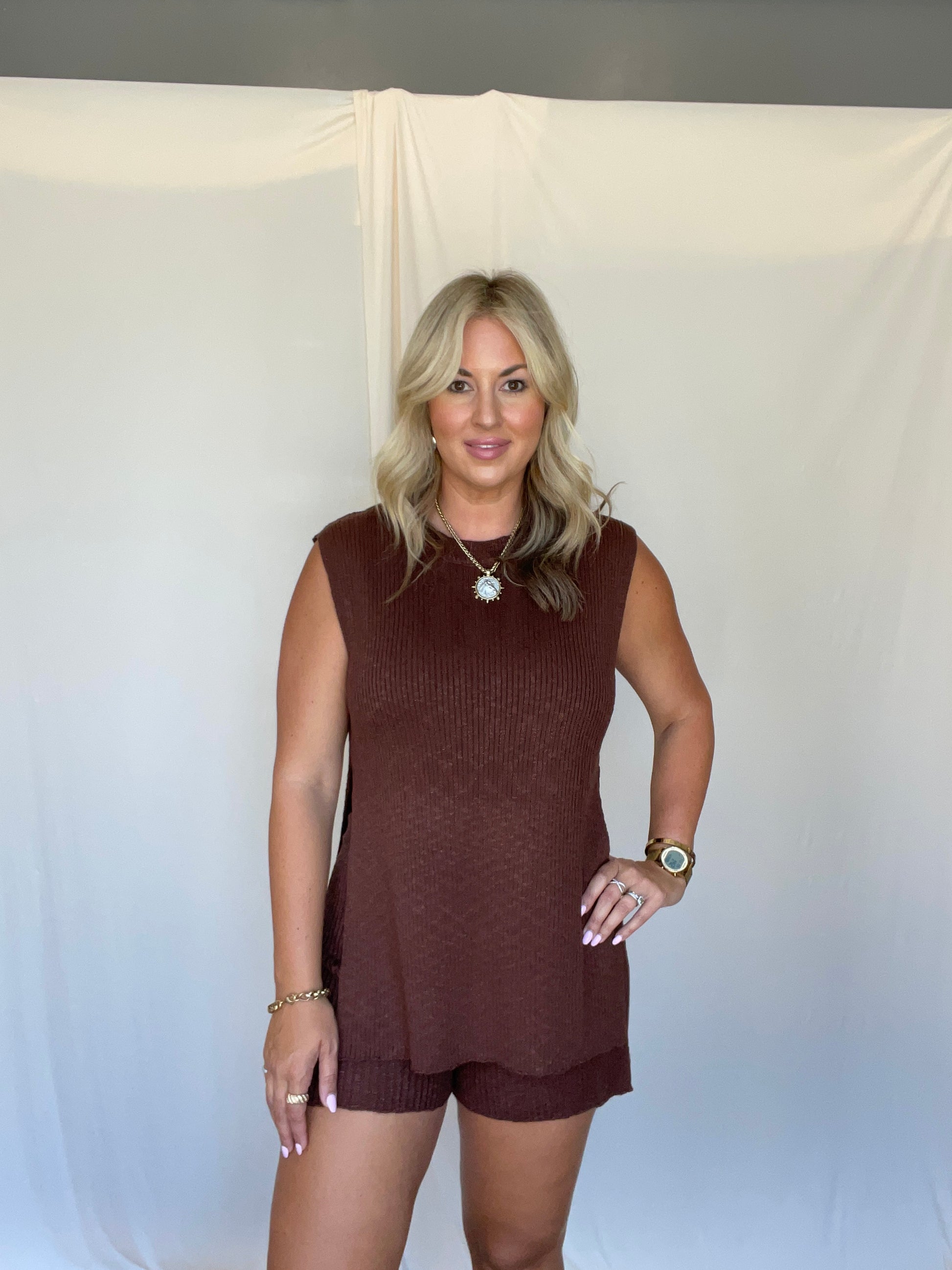 This playful brown set features a sleeveless top with side slits paired with comfy shorts, perfect for a sweet and breezy look.