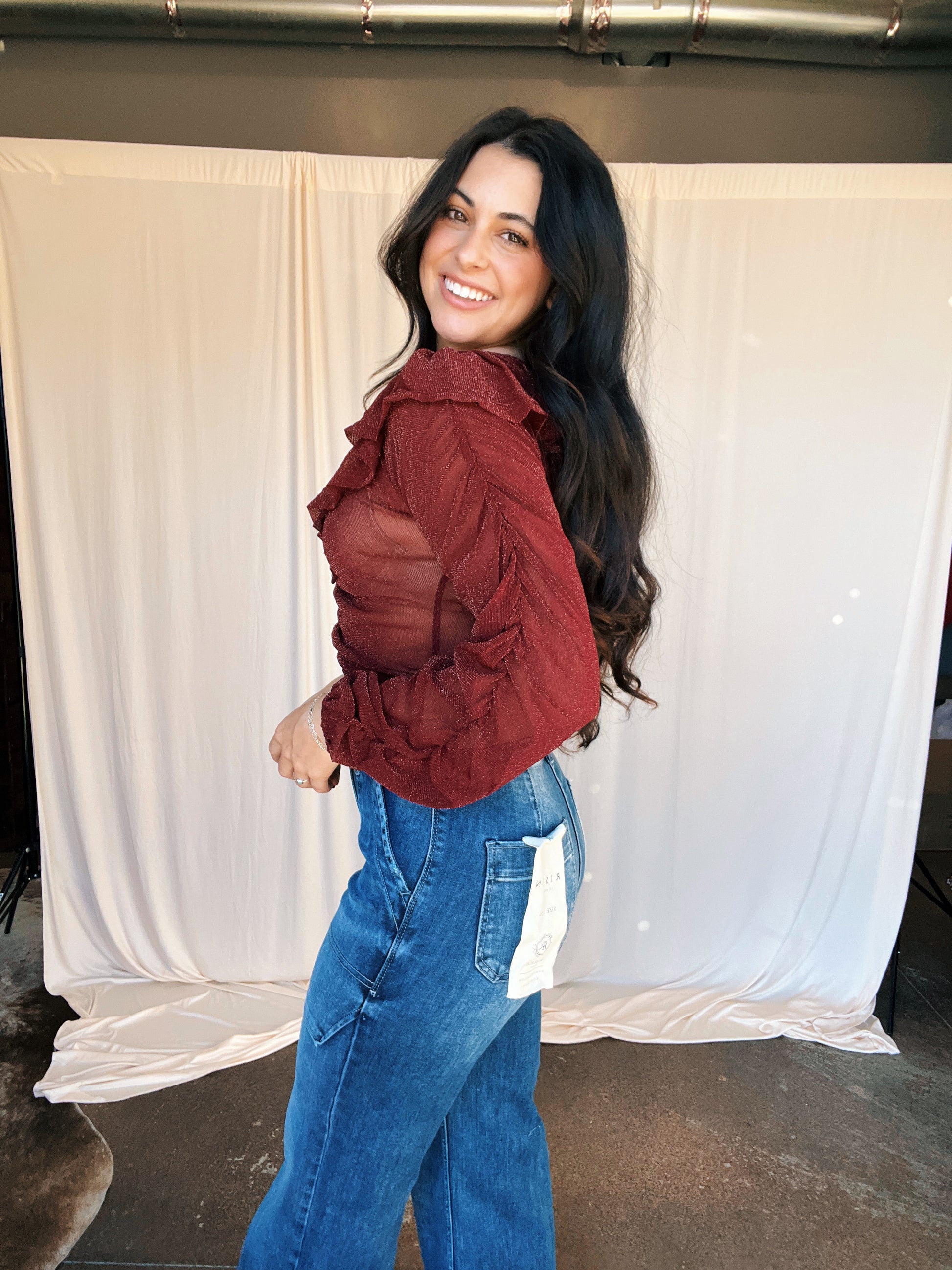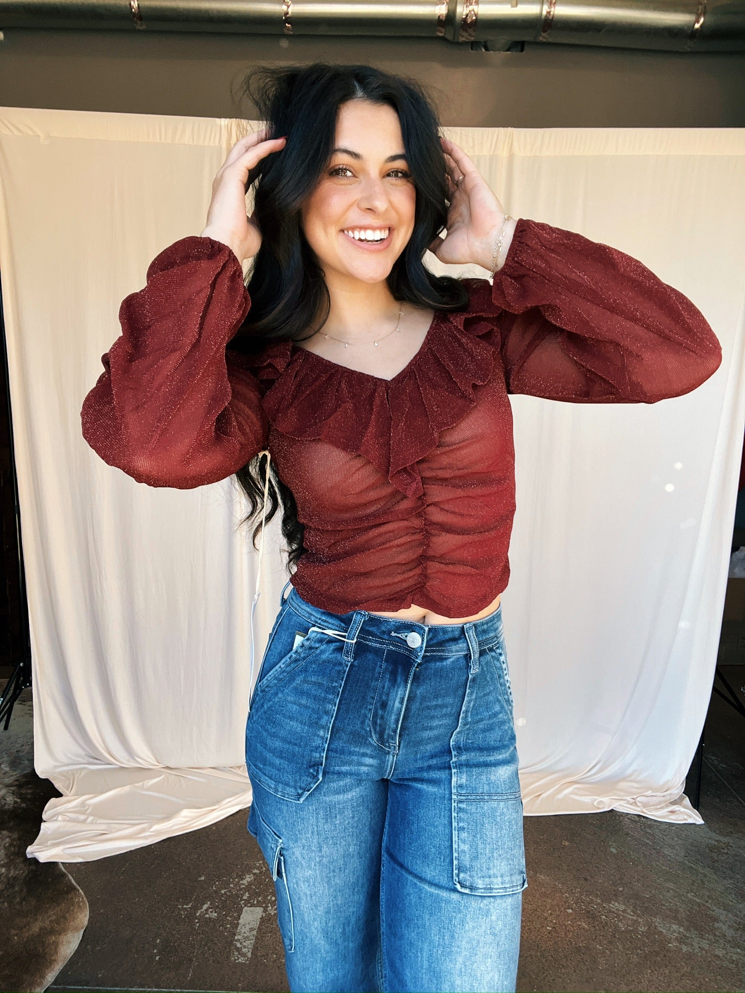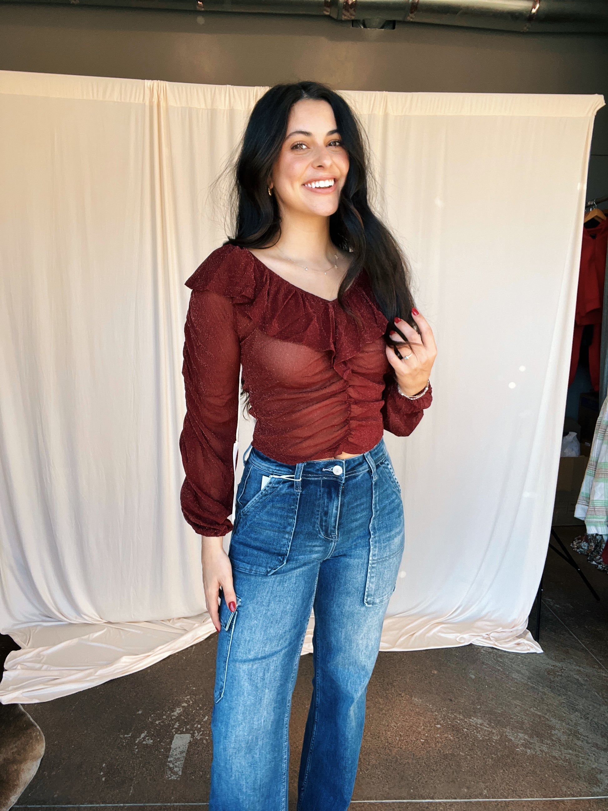 Get ready to shine this holiday season with our Touch of Sparkle Top! This burgundy top features a glittery finish and ruched detailing for a glamorous touch. Perfect for adding a festive sparkle to any outfit. (Tis the season to sparkle!)