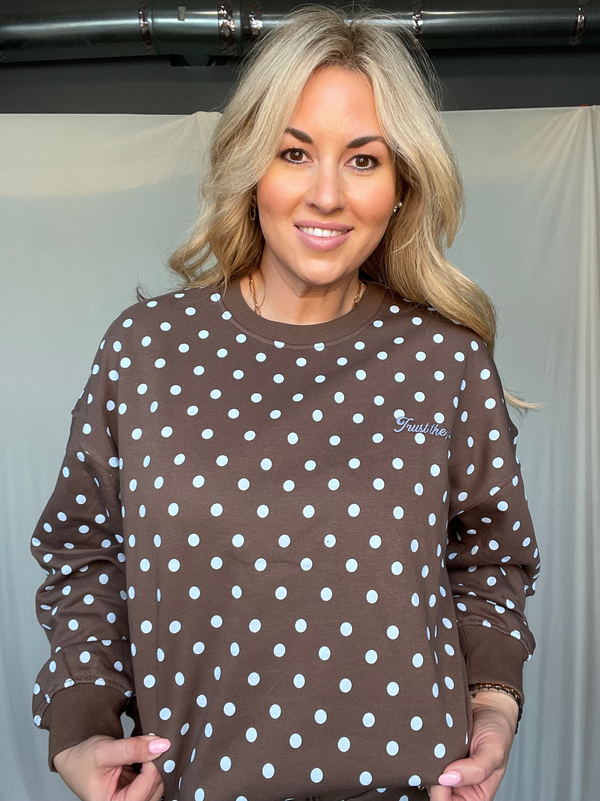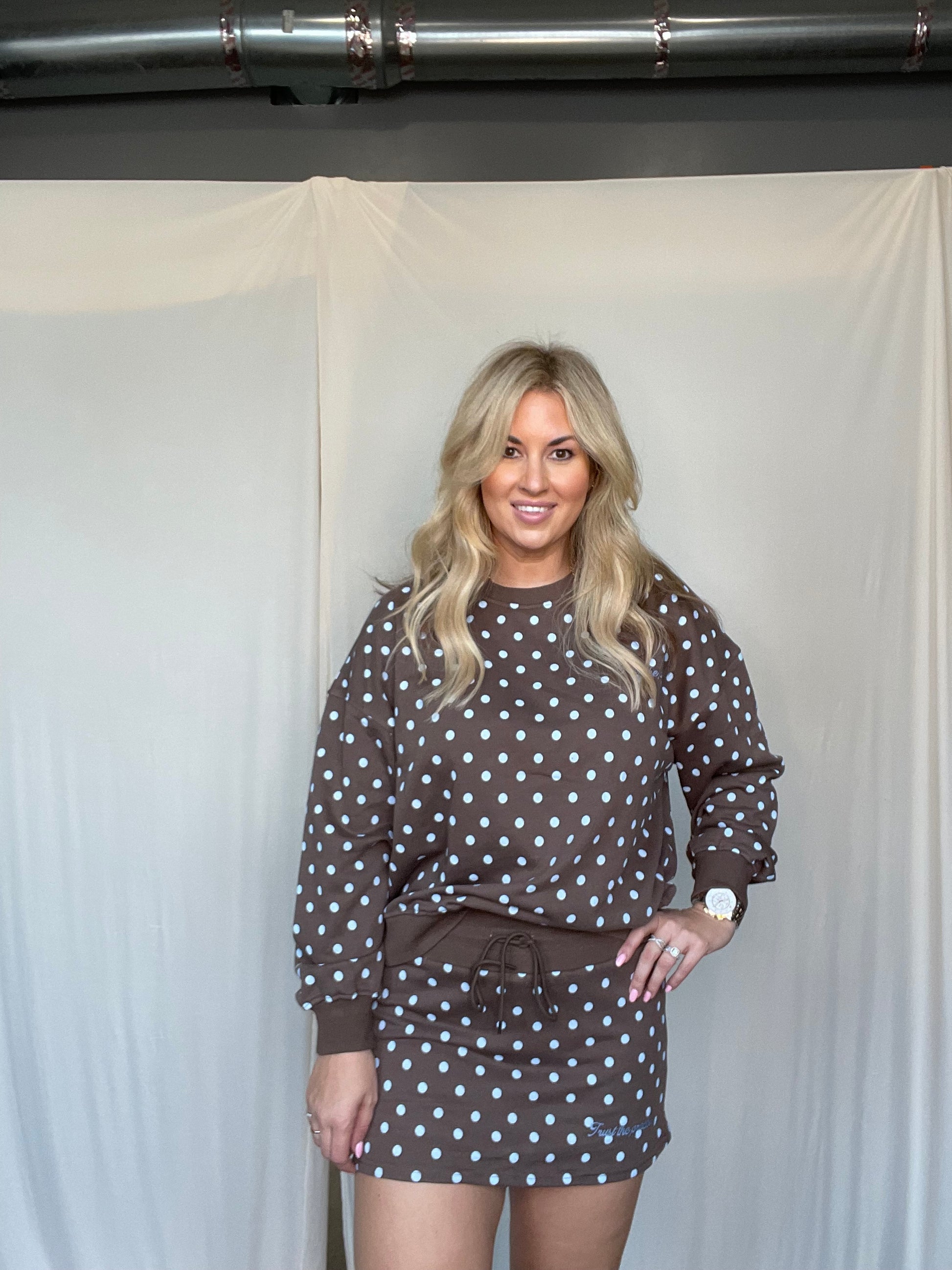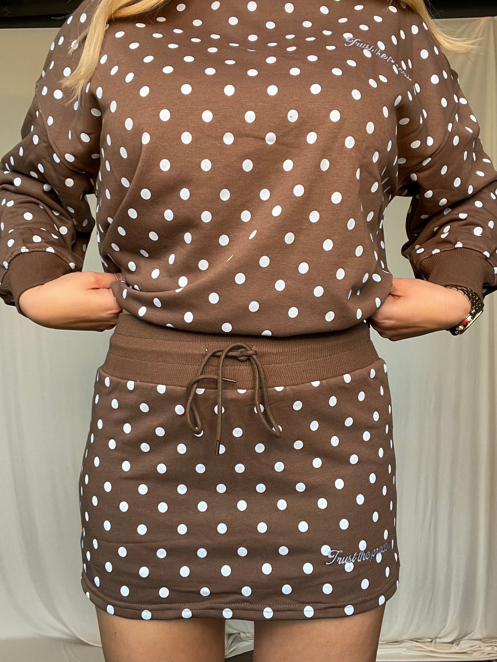 This adorable two-piece combo features a cozy brown sweatshirt paired with a matching skort, both adorned with cheerful blue polka dots. It's the kind of set that makes getting dressed fun—perfect for anyone who loves quirky, eye-catching style. Mix-and-match potential included!