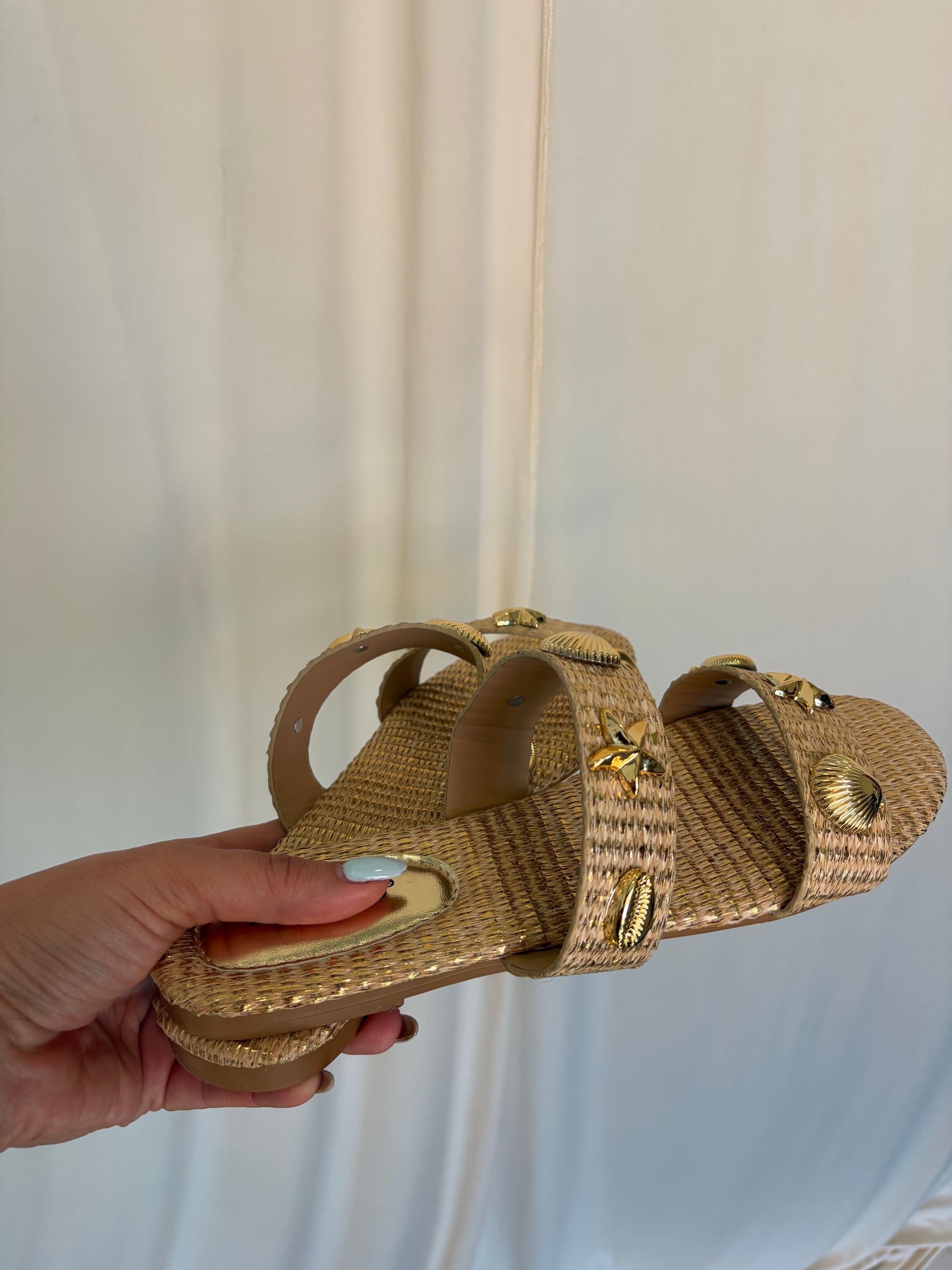 Raffia braided sandals with ocean charms.
