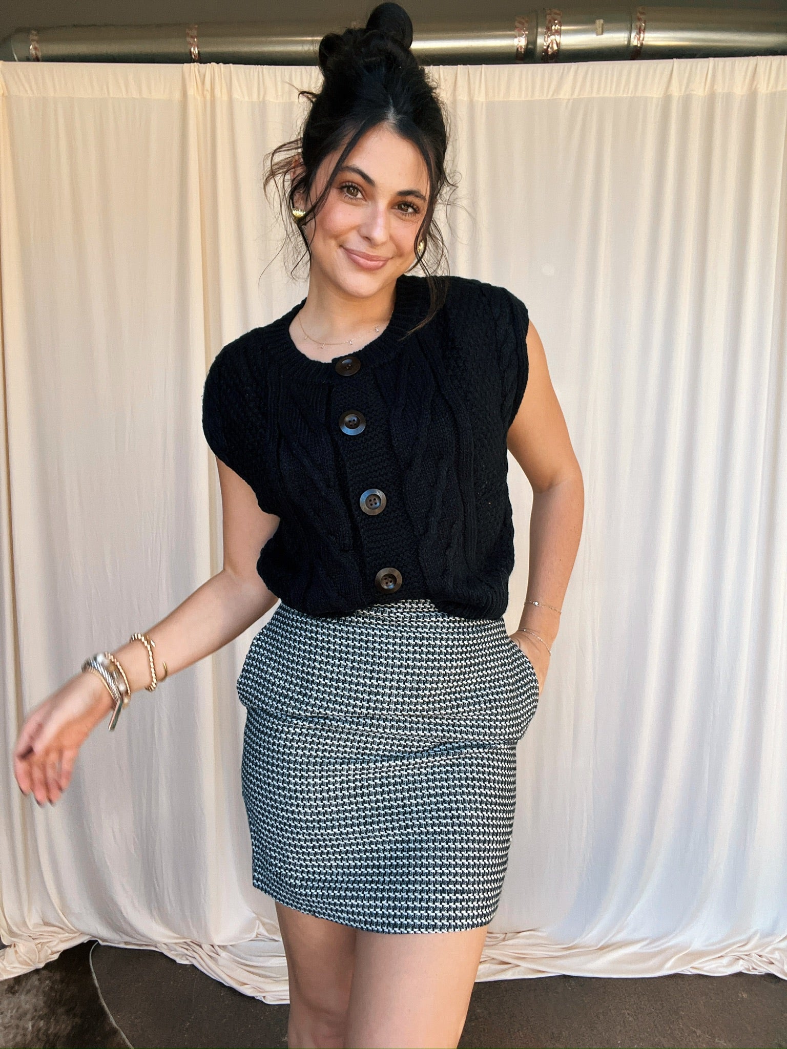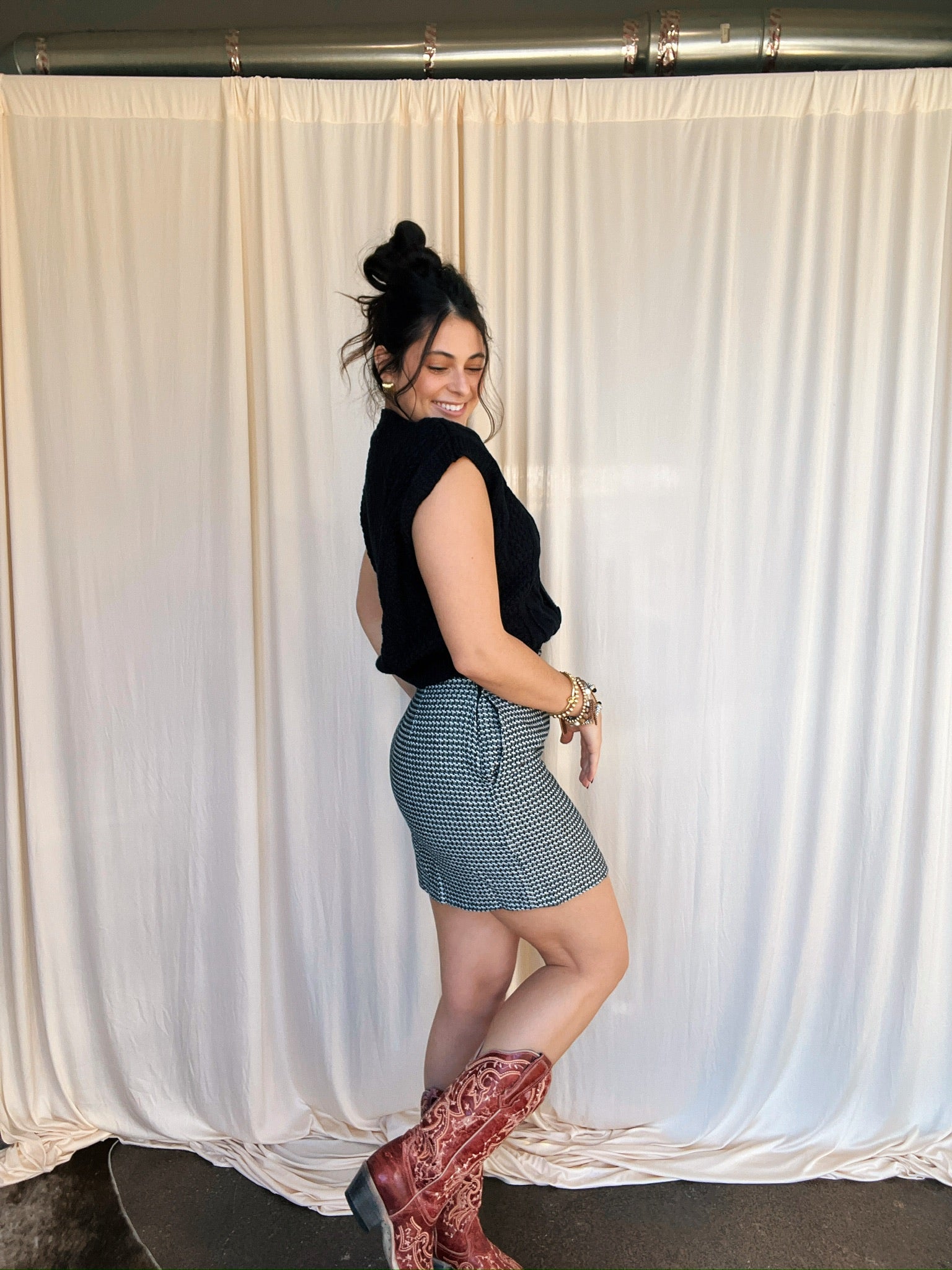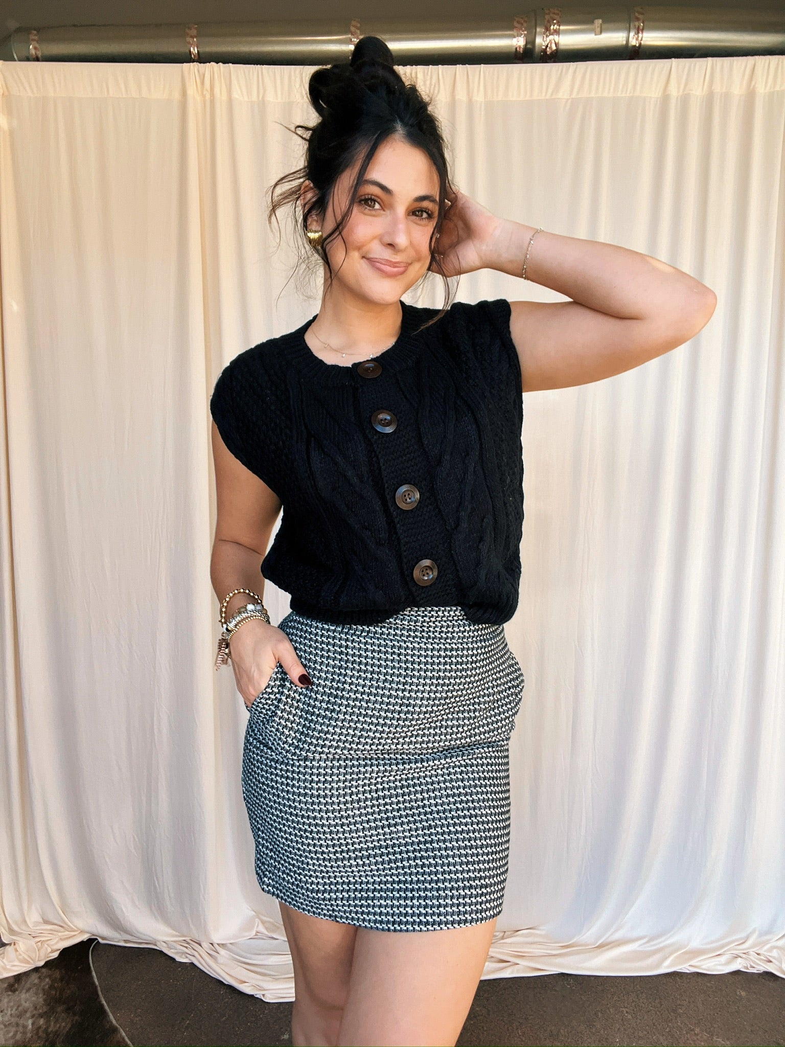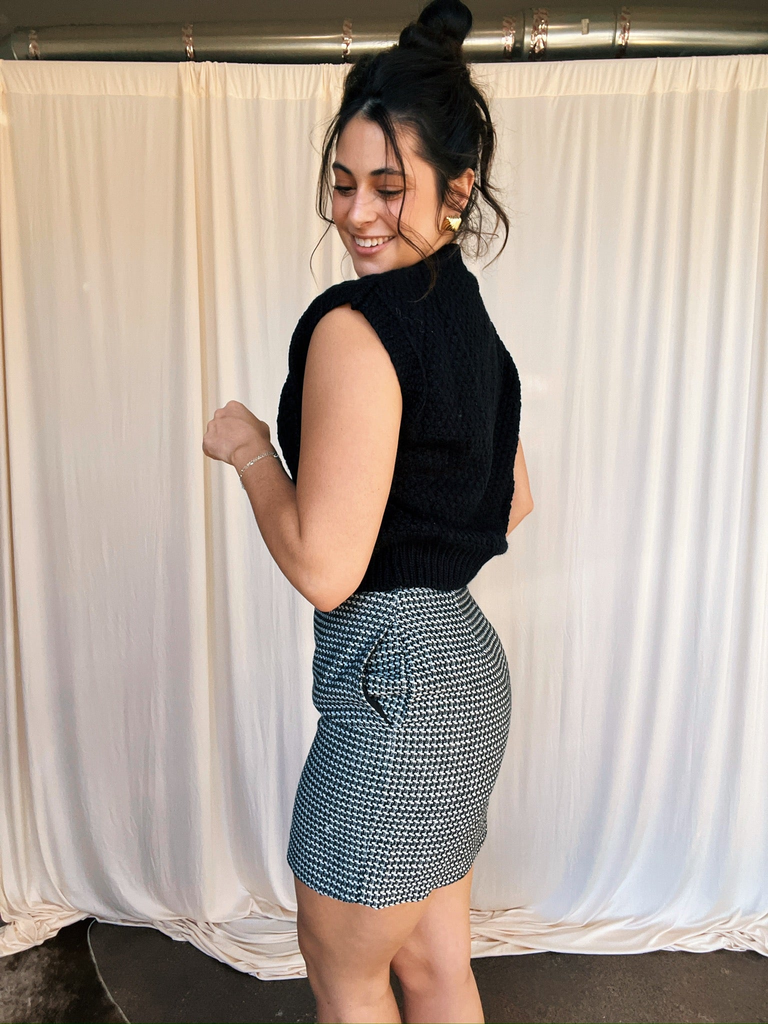 Houndstooth print skirt.