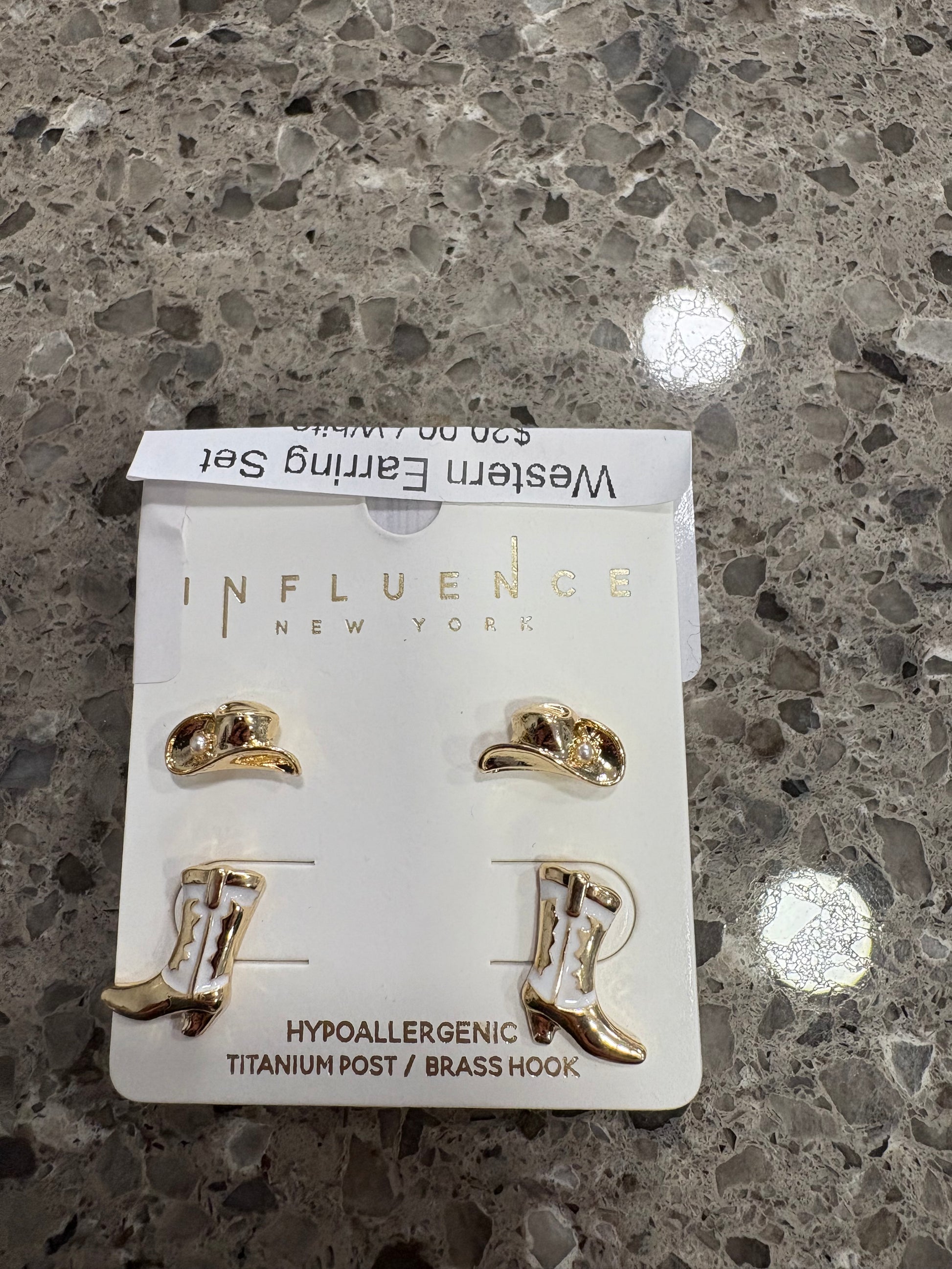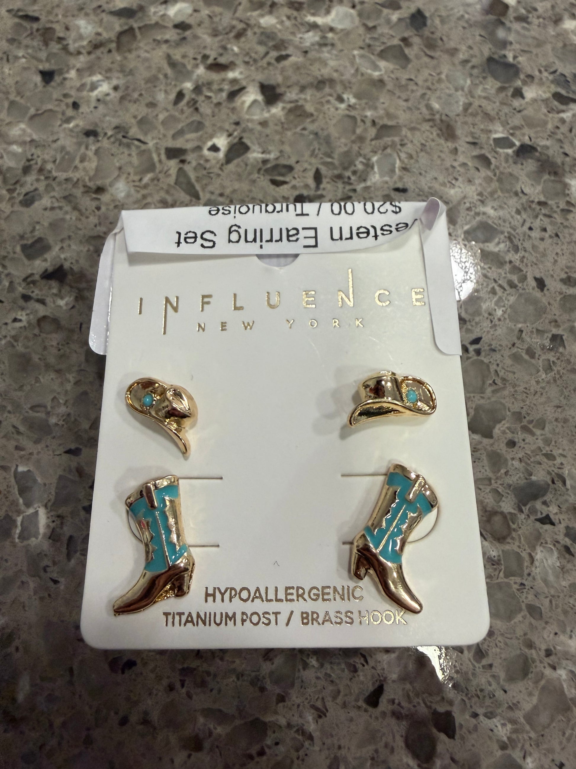 Metal hat and boots earring set that comes in three colors pink, turquoise, and white